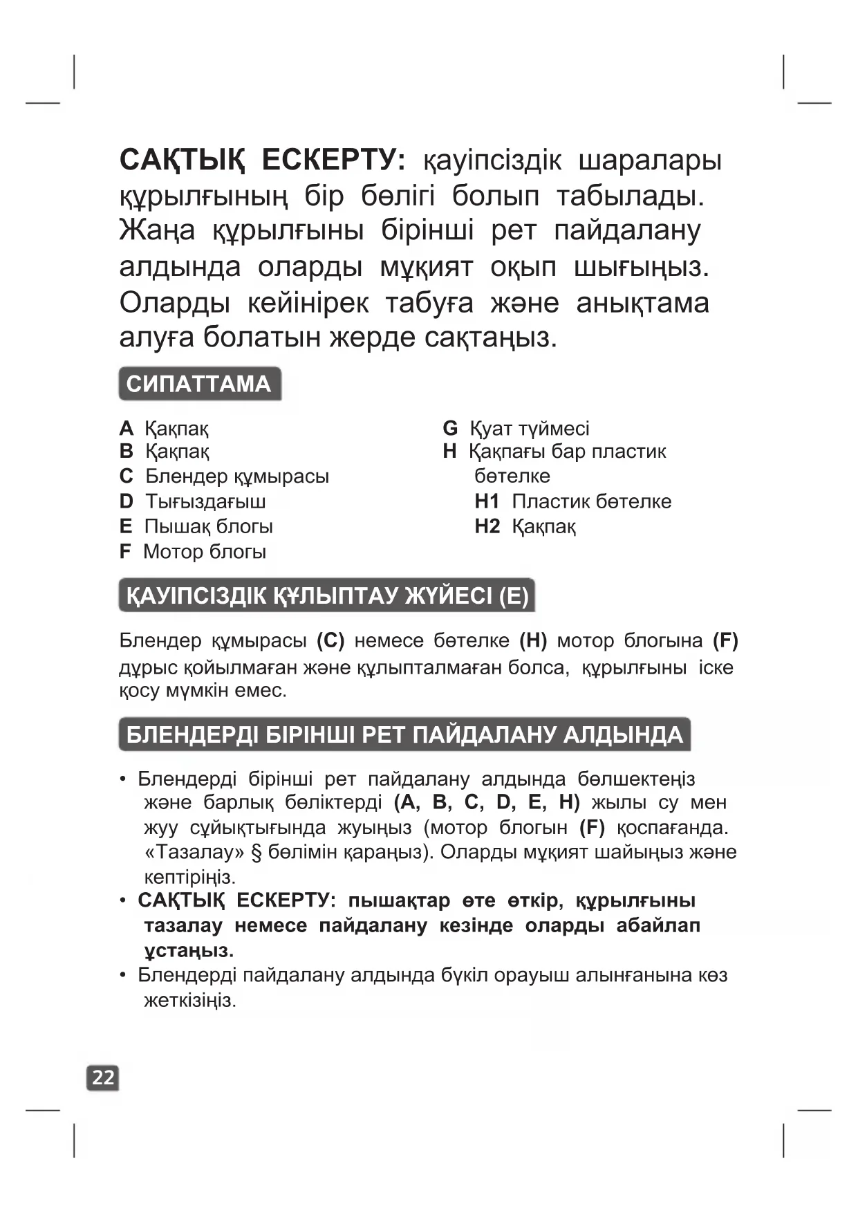 H1 Пластик бөтелке H2 Қақпақ ҚАУІПСІЗДІК ҚҰЛЫПТАУ ЖҮЙЕСІ (E) Блендер құмырасы (C) немесе бөтелке (H) мотор блогына (F) дұрыс қойылмаған және құлыпталмаған болса, құрылғыны іске қосу мүмкін емес. БЛЕНДЕРДІ БІРІНШІ РЕТ ПАЙДАЛАНУ АЛДЫНДА