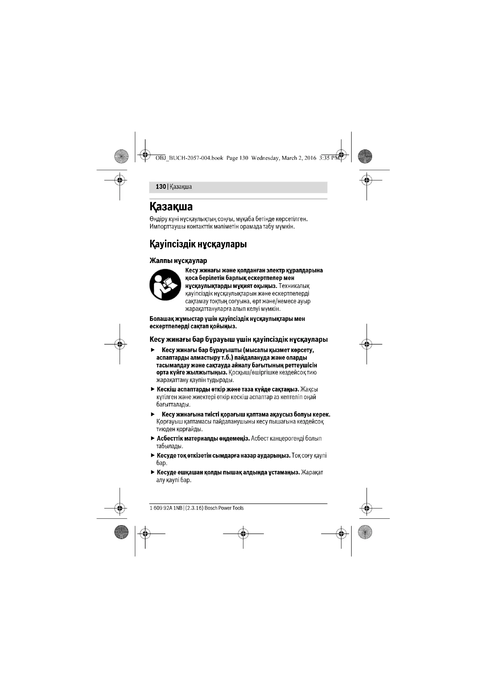 Разільну насадку, приладдя і упаковку треба здавати на екологічно чисту повторну переробку. Можливі зміни. OBJ_BUCH-2057-004.book Page 129 Wednesday, March 2, 2016 3:35 PM130 | Қaзақша 1 609 92A 1NB | (2.3.16) Bosch Power Tools Қaзақша Өндіру күні нұсқаулықтың соңғы, мұқаба бетінде көрсетілген. Импорттаушы контакттік мәліметін орамада табу мүмкін. Қауіпсіздік нұсқаулары Жалпы нұсқаулар Кесу жинағы және қолданған электр құралдарына қоса берілетін барлық ескертпелер мен нұсқаулықтарды мұқият оқыңыз. Техникалық қауіпсіздік нұсқаулықтарын және ескертпелерді сақтамау тоқтың соғуына, өрт және/немесе ауыр жарақаттануларға алып келуі мүмкін. Болашақ жұмыстар үшін қауіпсіздік нұсқаулықтары мен ескертпелерді сақтап қойыңыз. Кесу жинағы бар бұрауыш үшін қауіпсіздік нұсқаулары Кесу жинағы бар бұрауышты (мысалы қызмет көрсету, аспаптарды алмастыру т.б.) пайдалануда және оларды тасымалдау және сақтауда айналу бағытының реттеушісін орта күйге жылжытыңыз. Қосқыш/өшіргішке кездейсоқ тию жарақаттану қаупін тудырады. Кескіш аспаптарды өткір және таза күйде сақтаңыз. Жақсы күтілген және жиектері өткір кескіш аспаптар аз кептеліп оңай бағытталады. Кесу жинағына тиісті қорағыш қаптама ақаусыз болуы керек. Қорғауыш қаптамасы пайдаланушыны кесу пышағына кездейсоқ тиюден қорғайды. Асбесттік материалды өңдемеңіз. Асбест канцерогенді болып