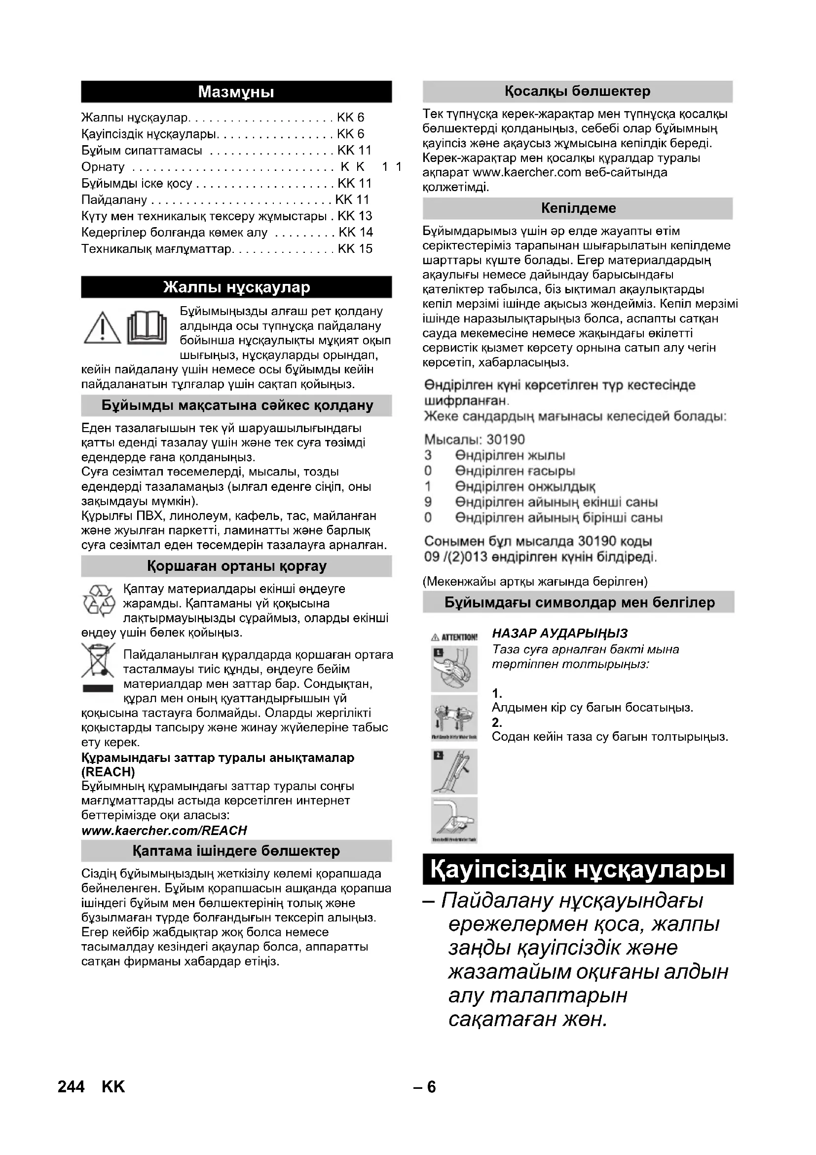 Жалпы нұсқаулар. . . . . . . . . . . . . . . . . . . . . KK 6 Қауіпсіздік нұсқаулары. . . . . . . . . . . . . . . . . KK 6 Бұйым сипаттамасы . . . . . . . . . . . . . . . . . . KK 11 Орнату . . . . . . . . . . . . . . . . . . . . . . . . . . . . .KK 11 Бұйымды іске қосу . . . . . . . . . . . . . . . . . . . . KK 11 Пайдалану . . . . . . . . . . . . . . . . . . . . . . . . . . KK 11 Күту мен техникалық тексеру жұмыстары . KK 13 Кедергілер болғанда көмек алу . . . . . . . . . KK 14 Техникалық мағлұматтар. . . . . . . . . . . . . . . KK 15 Жалпы нұсқаулар Бұйымды мақсатына сəйкес қолдану Қоршаған ортаны қорғау Қаптама ішіндеге бөлшектер Қосалқы бөлшектер