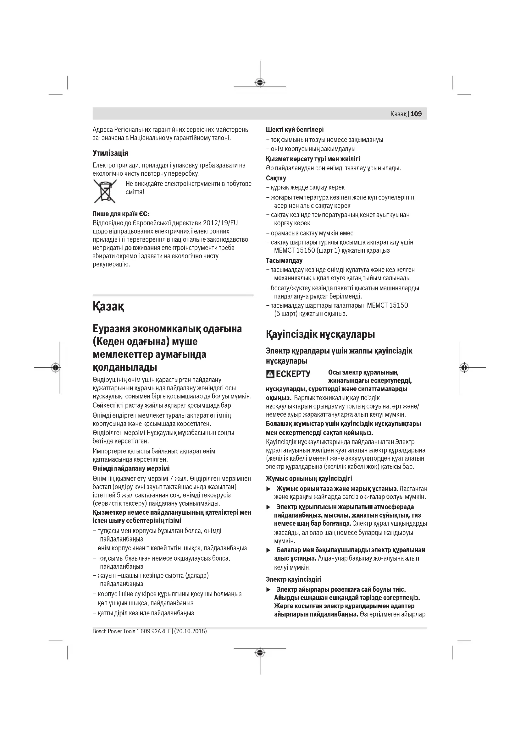 Өндіруші талаптары мен нормаларының сақталуымен электр күралын жәндеу және кепілді қызмет көрсету барлық мемлекеттер аумағында тек "Роберт Бош" фирмалық немесе авторизацияланған қызмет көрсету орталықтарында орындалады. ЕСКЕРТУ! Заңсыз жолменәкелінген өнімдерді пайдалану қауіпті, денсаулығыңзыға-зиян келтіруі мүмкін. Өнімдерді заңсыз жасау және тарату әкімшілік және қылмыстық тәртіп бойынша Заңмен қудаланады.