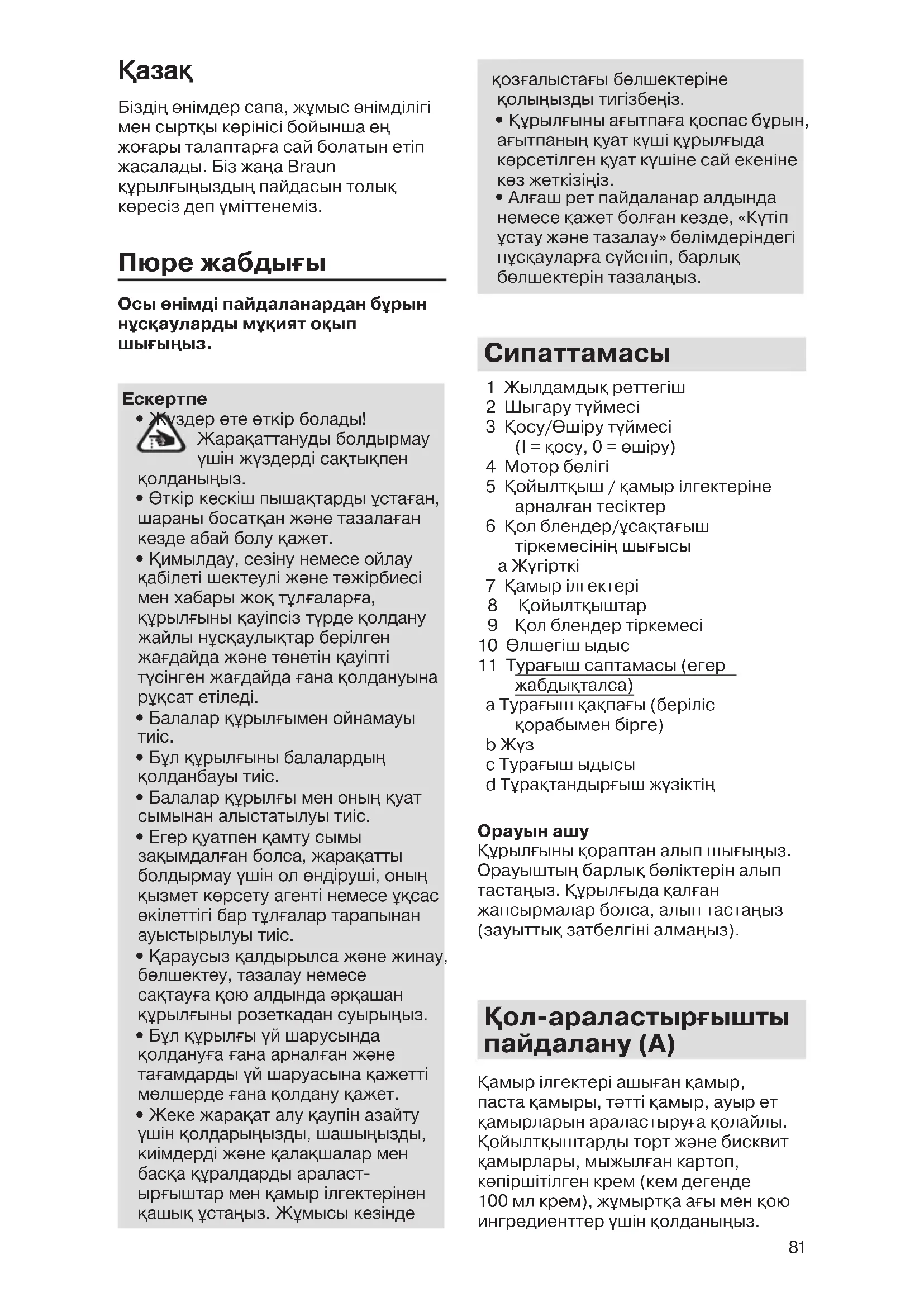 Бізді¨ ©німдер сапа, ж´мыс ©німділігі мен сырт¼ы к©рінісі бойынша е¨ жоÃары талаптарÃа сай болатын етіп жасалады. Біз жа¨а Braun ¼´рылÃы¨ызды¨ пайдасын толы¼ к©ресіз деп Æміттенеміз. Пюре жабды[ы Осы ^німді пайдаланардан б~рын н~сауларды м~ият оып