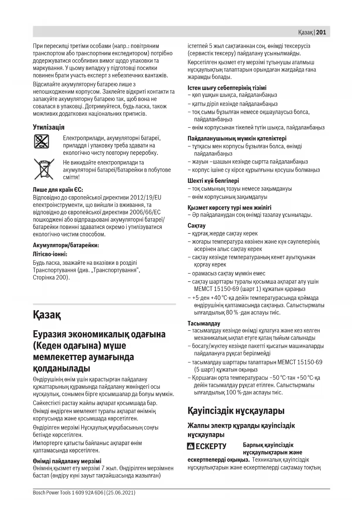 Барлық қауіпсіздік нұсқаулықтарын және ескертпелерді оқыңыз. Техникалық қауіпсіздік нұсқаулықтарын және ескертпелерді сақтамау тоқтың Bosch Power Tools 1 609 92A 6D6 | (25.06.2021)202 | Қазақ соғуына, өрт және/немесе ауыр жарақаттануларға алып келуі мүмкін. Болашақ жұмыстар үшін қауіпсіздік нұсқаулықтары мен ескертпелерді сақтап қойыңыз. Қауіпсіздік нұсқаулықтарында пайдаланылған Электр құрал атауының желіден қуат алатын электр құралдарына (желілік кабелі менен) және аккумуляторден қуат алатын электр құралдарына (желілік кабелі жоқ) қатысы бар. Жұмыс орнының қауіпсіздігі u Жұмыс орнын таза және жарық ұстаңыз. Ластанған және қараңғы жайларда сәтсіз оқиғалар болуы мүмкін. u Электр құрылғысын жарылатын атмосферада пайдаланбаңыз, мысалы, жанатын сұйықтық, газ немесе шаң бар болғанда. Электр құрал ұшқындарды жасайды, ал олар шаң немесе буларды жандыруы