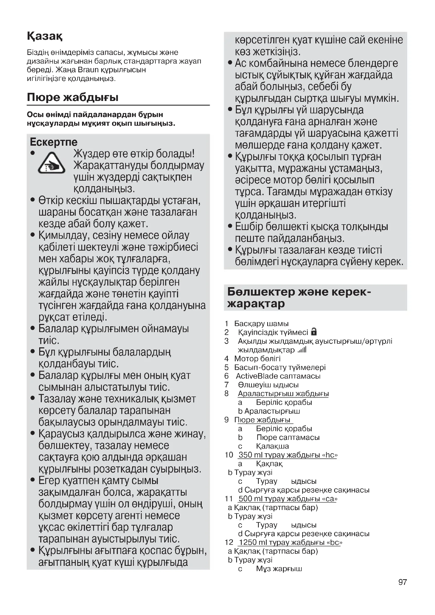 Бізді німдеріміз сапасы, жмысы жне дизайны жаынан барлы стандарттара жауап береді. Жаа Braun рылысын игілігіізге олданыыз. Пюре жабдыы Осы ¡німді пайдаланардан б£рын н£сауларды м£ият оып шыы¥ыз.