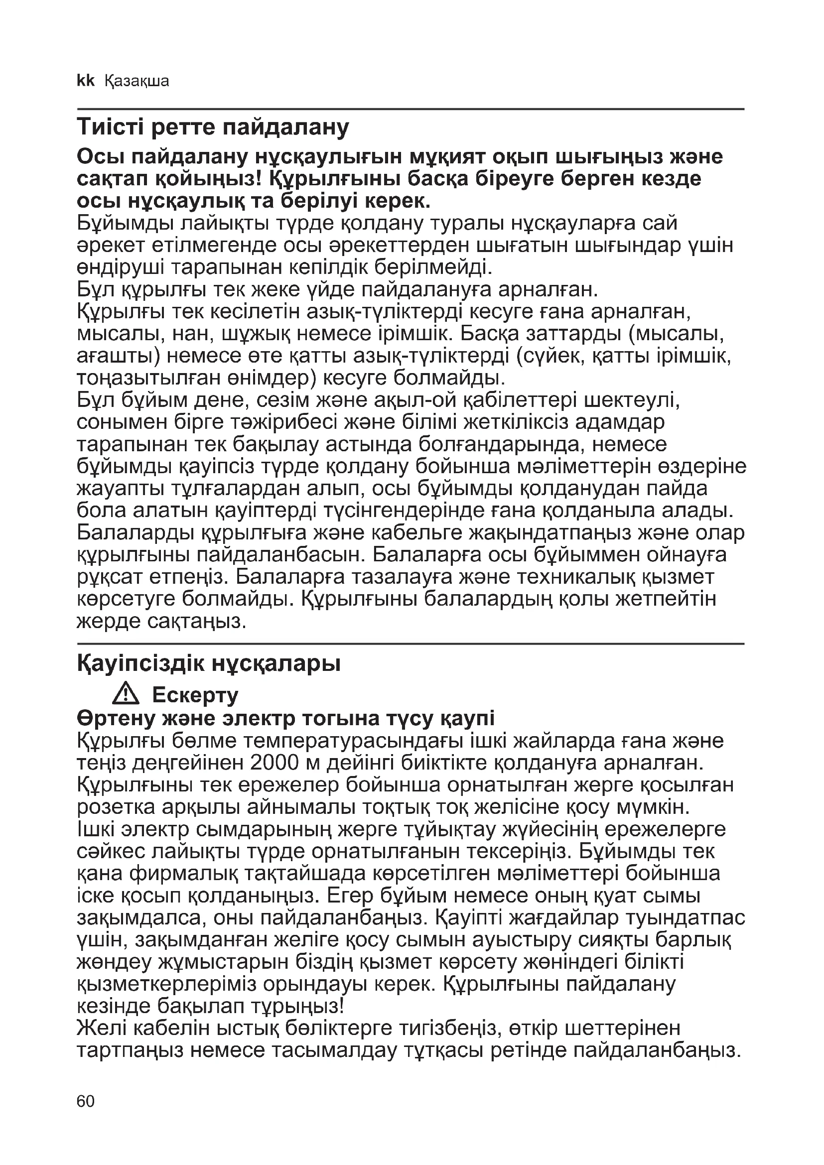 Утилизируйте упаковку с использо- ванием экологически безопасных методов. Данный прибор имеет отметку о соответствии европей- ским нормам 2012/19/EU утили- зации электрических и электрон- ных приборов (waste electrical and electronic equipment – WEEE). Дан- ные нормы определяют действую- щие на территории Евросоюза пра- вила возврата и утилизации старых приборов. Информацию об акту- альных возможностях утилизации Вы можете получить в магазине, в котором Вы приобрели прибор. Условия гарантийного обслуживания Получить исчерпывающую информацию об условиях гарантийного обслужи- вания Вы можете в Вашем ближайшем авторизованном сервисном центре, или в сервисном центре от производителя ООО «БСХ Бытовая техника», или в сопроводительной документации. Мы оставляем за собой право на внесение изменений.60 kk Қазақша Тиісті ретте пайдалану Осы пайдалану нұсқаулығын мұқият оқып шығыңыз және сақтап қойыңыз! Құрылғыны басқа біреуге берген кезде осы нұсқаулық та берілуі керек. Бұйымды лайықты түрде қолдану туралы нұсқауларға сай әрекет етілмегенде осы әрекеттерден шығатын шығындар үшін өндіруші тарапынан кепілдік берілмейді. Бұл құрылғы тек жеке үйде пайдалануға арналған. Құрылғы тек кесілетін азық-түліктерді кесуге ғана арналған, мысалы, нан, шұжық немесе ірімшік. Басқа заттарды (мысалы, ағашты) немесе өте қатты азық-түліктерді (сүйек, қатты ірімшік, тоңазытылған өнімдер) кесуге болмайды. Бұл бұйым дене, сезім және ақыл-ой қабілеттері шектеулі, сонымен бірге тәжірибесі және білімі жеткіліксіз адамдар тарапынан тек бақылау астында болғандарында, немесе бұйымды қауіпсіз түрде қолдану бойынша мәліметтерін өздеріне жауапты тұлғалардан алып, осы бұйымды қолданудан пайда бола алатын қауіптерді түсінгендерінде ғана қолданыла алады. Балаларды құрылғыға және кабельге жақындатпаңыз және олар құрылғыны пайдаланбасын. Балаларға осы бұйыммен ойнауға рұқсат етпеңіз. Балаларға тазалауға және техникалық қызмет көрсетуге болмайды. Құрылғыны балалардың қолы жетпейтін жерде сақтаңыз. Қауіпсіздік нұсқалары W Ескерту Өртену және электр тогына түсу қаупі Құрылғы бөлме температурасындағы ішкі жайларда ғана және теңіз деңгейінен 2000 м дейінгі биіктікте қолдануға арналған. Құрылғыны тек ережелер бойынша орнатылған жерге қосылған розетка арқылы айнымалы тоқтық тоқ желісіне қосу мүмкін. Ішкі электр сымдарының жерге тұйықтау жүйесінің ережелерге сәйкес лайықты түрде орнатылғанын тексеріңіз. Бұйымды тек қана фирмалық тақтайшада көрсетілген мәліметтері бойынша іске қосып қолданыңыз. Егер бұйым немесе оның қуат сымы зақымдалса, оны пайдаланбаңыз. Қауіпті жағдайлар туындатпас үшін, зақымданған желіге қосу сымын ауыстыру сияқты барлық жөндеу жұмыстарын біздің қызмет көрсету жөніндегі білікті қызметкерлеріміз орындауы керек. Құрылғыны пайдалану кезінде бақылап тұрыңыз! Желі кабелін ыстық бөліктерге тигізбеңіз, өткір шеттерінен тартпаңыз немесе тасымалдау тұтқасы ретінде пайдаланбаңыз.61