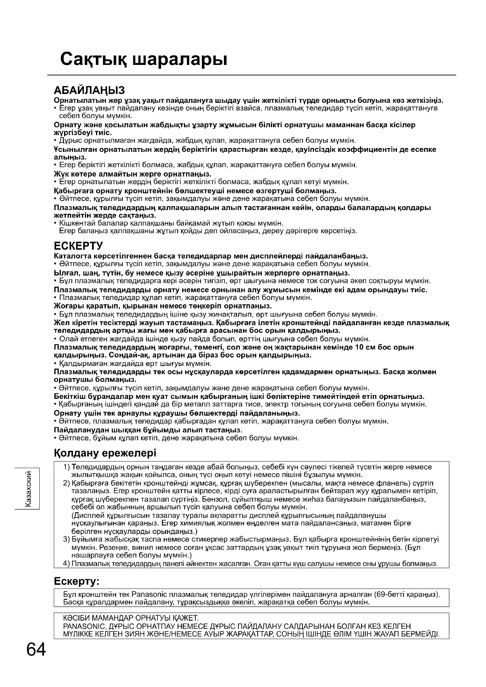Бұл кронштейн тек Panasonic плазмалық теледидар үлгілерімен пайдалануға арналған (69-бетті қараңыз). Басқа құралдармен пайдалану, тұрақсыздыққа əкеліп, жарақатқа себеп болуы мүмкін. КƏСІБИ МАМАНДАР ОРНАТУЫ ҚАЖЕТ. PANASONIC, ДҰРЫС ОРНАТПАУ НЕМЕСЕ ДҰРЫС ПАЙДАЛАНУ САЛДАРЫНАН БОЛҒАН КЕЗ КЕЛГЕН МҮЛІККЕ КЕЛГЕН ЗИЯН ЖƏНЕ/НЕМЕСЕ АУЫР ЖАРАҚАТТАР, СОНЫҢ ІШІНДЕ ӨЛІМ ҮШІН ЖАУАП БЕРМЕЙДІ.65