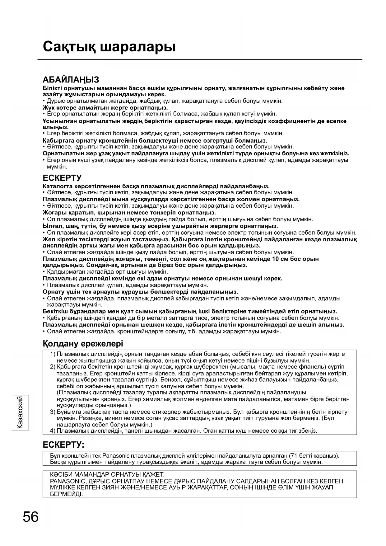 Бұл кронштейн тек Panasonic плазмалық дисплей үлгілерімен пайдаланылуға арналған (71-бетті қараңыз). Басқа құрылғымен пайдалану тұрақсыздыққа əкеліп, адамды жарақаттауға себеп болуы мүмкін. КƏСІБИ МАМАНДАР ОРНАТУЫ ҚАЖЕТ. PANASONIC, ДҰРЫС ОРНАТПАУ НЕМЕСЕ ДҰРЫС ПАЙДАЛАНУ САЛДАРЫНАН БОЛҒАН КЕЗ КЕЛГЕН МҮЛІККЕ КЕЛГЕН ЗИЯН ЖƏНЕ/НЕМЕСЕ АУЫР ЖАРАҚАТТАР, СОНЫҢ ІШІНДЕ ӨЛІМ ҮШІН ЖАУАП БЕРМЕЙДІ.57