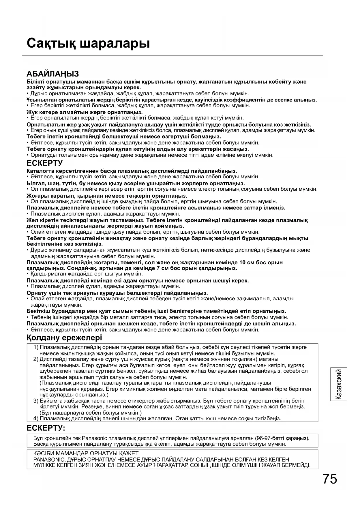 Бұл кронштейн тек Panasonic плазмалық дисплей үлгілерімен пайдаланылуға арналған (96-97-бетті қараңыз). Басқа құрылғымен пайдалану тұрақсыздыққа əкеліп, адамды жарақаттауға себеп болуы мүмкін. КƏСІБИ МАМАНДАР ОРНАТУЫ ҚАЖЕТ. PANASONIC, ДҰРЫС ОРНАТПАУ НЕМЕСЕ ДҰРЫС ПАЙДАЛАНУ САЛДАРЫНАН БОЛҒАН КЕЗ КЕЛГЕН МҮЛІККЕ КЕЛГЕН ЗИЯН ЖƏНЕ/НЕМЕСЕ АУЫР ЖАРАҚАТТАР, СОНЫҢ ІШІНДЕ ӨЛІМ ҮШІН ЖАУАП БЕРМЕЙДІ.76