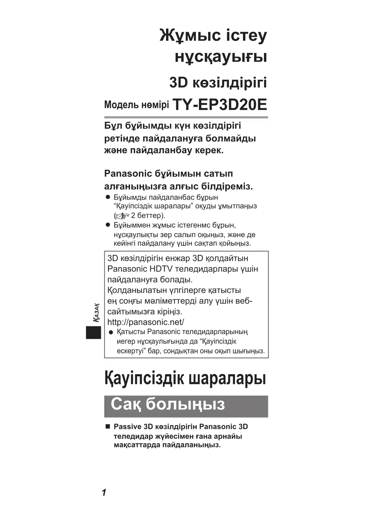 3D көзілдірігі Модель нөмірі TY-EP3D20E Бұл бұйымды күн көзілдірігі ретінде пайдалануға болмайды жəне пайдаланбау керек. Panasonic бұйымын сатып алғаныңызға алғыс білдіреміз.Бұйымды пайдаланбас бұрын “Қауіпсіздік шаралары” оқуды ұмытпаңыз ( 1 - 2 беттер). Бұйыммен жұмыс істегенмс бұрын, нұсқаулықты зер салып оқыңыз, жəне де кейінгі пайдалану үшін сақтап қойыңыз. 3D көзілдірігін енжар 3D қолдайтын Panasonic HDTV теледидарлары үшін пайдалануға болады.Қолданылатын үлгілерге қатысты ең соңғы мəліметтерді алу үшін веб- сайтымызға кіріңіз.http://panasonic.net/Қатысты Panasonic теледидарларының иегер нұсқаулығында да “Қауіпсіздік ескертуі” бар, сондықтан оны оқып шығыңыз. Қауіпсіздік шаралары Сақ болыңыз Passive 3D көзілдірігін Panasonic 3D