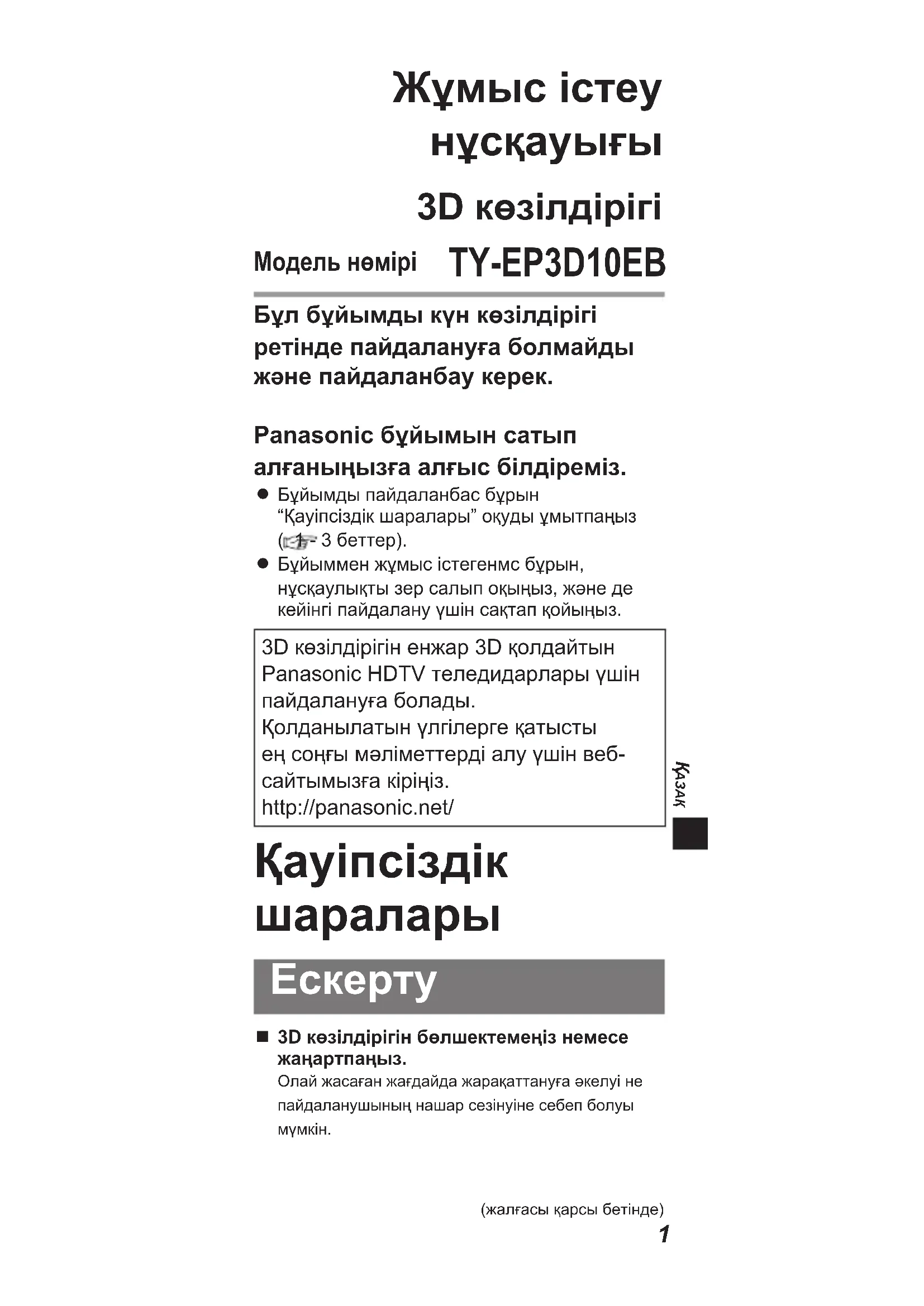 Бұйыммен жұмыс істегенмс бұрын, нұсқаулықты зер салып оқыңыз, және де кейінгі пайдалану үшін сақтап қойыңыз.3D көзілдірігін енжар 3D қолдайтын Panasonic HDTV теледидарлары үшін пайдалануға болады.Қолданылатын үлгілерге қатысты ең соңғы мәліметтерді алу үшін веб-сайтымызға кіріңіз.http://panasonic.net/ Қауіпсіздік
