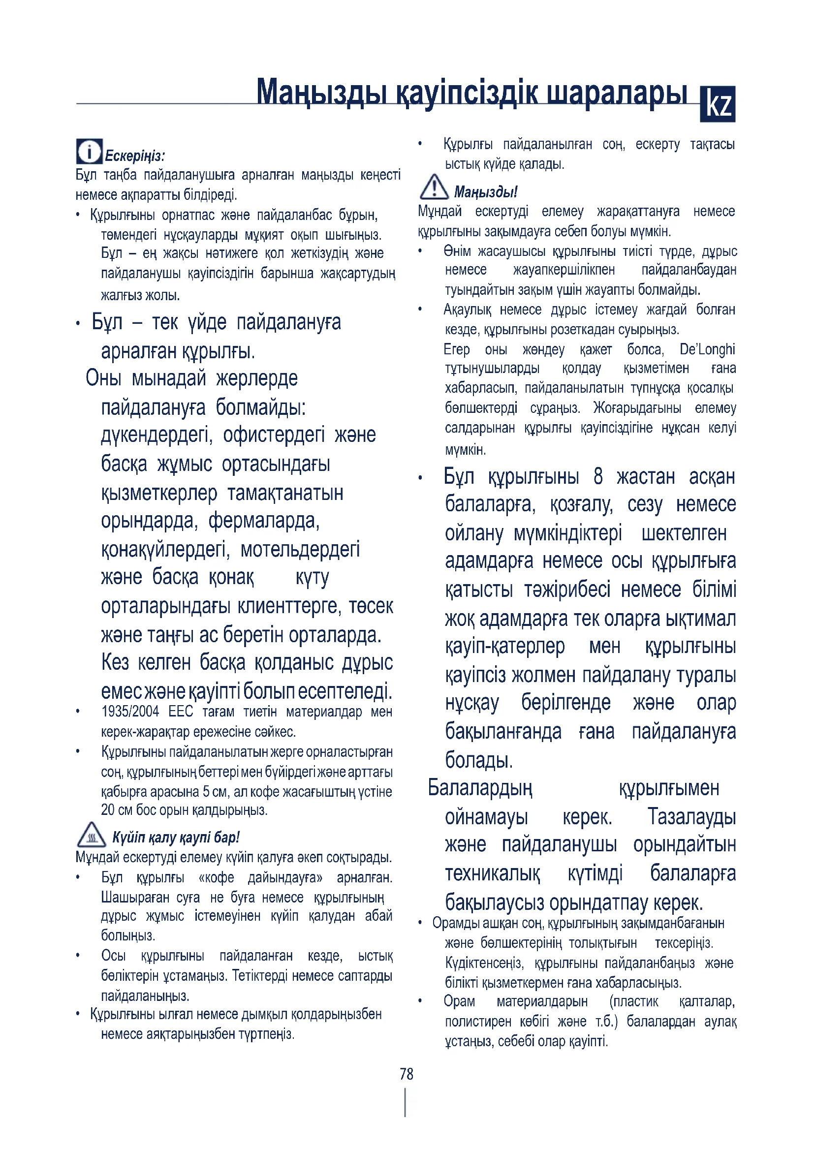 - Осы құрылғының қуат кабелін пайдаланушы өзі ауыстырмауы керек, себебі бұл операция арнайы құралды пайдалану қажет болуы мүмкін. Егер ол зақымданса немесе оны ауыстыру керек болса, барлық қауіп-қатерлердің алдын алу үшін De’Longhi тұтынушыны қолдау қызметімен хабарласыңыз.