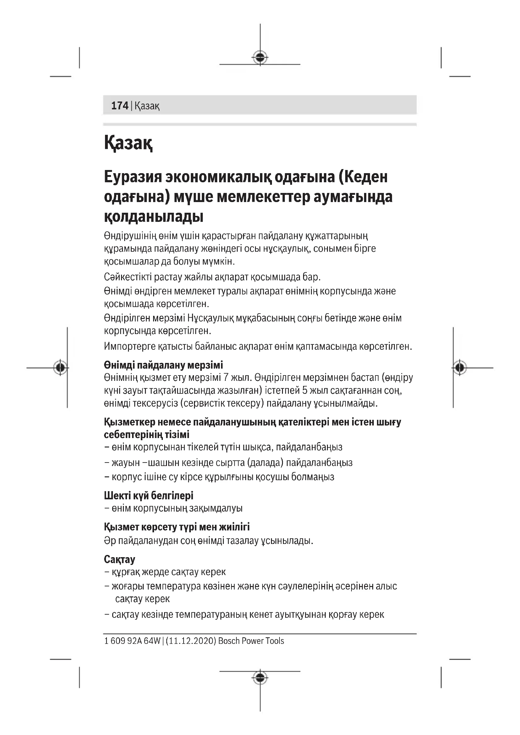 – құрғақ жерде сақтау керек – жоғары температура көзінен және күн сәулелерінің әсерінен алыс сақтау керек – сақтау кезінде температураның кенет ауытқуынан қорғау керек 1 609 92A 64W | (11.12.2020) Bosch Power ToolsҚазақ | 175 – егер құрал жұмсақ сөмке немесе пластик кейсте жеткізілсе оны осы өзінің қорғағыш қабында сақтау ұсынылады – сақтау шарттары туралы қосымша ақпарат алу үшін МЕМСТ 15150-69 (Шарт 1) құжатын қараңыз