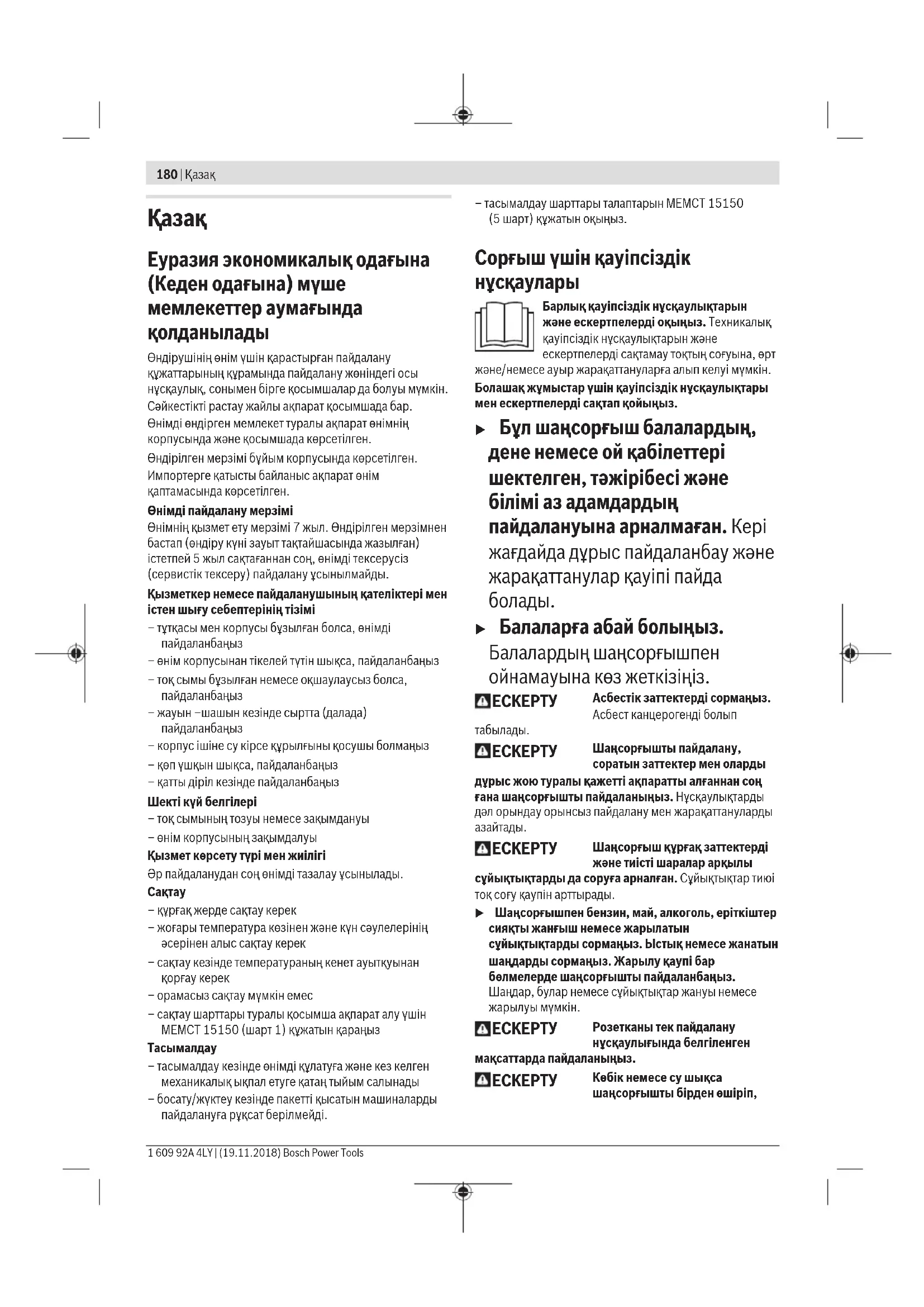 Сұрақтар қою және қосалқы бөлшектерге тапсырыс беру кезінде міндетті түрде өнімдің зауыттық тақтайшасындағы 10-санды өнім нөмірін жазыңыз. Өндіруші талаптары мен нормаларының сақталуымен электр құралын жөндеу және кепілді қызмет көрсету барлық мемлекеттер аумағында тек “Роберт Бош” фирмалық немесе авторизацияланған қызмет көрсету орталықтарында орындалады. ЕСКЕРТУ! Заңсыз жолмен әкелінген өнімдерді пайдалану қауіпті, денсаулығыңызға зиян келтіруі мүмкін. Өнімдерді заңсыз жасау және тарату әкімшілік және қылмыстық тәртіп бойынша Заңмен қудаланады.