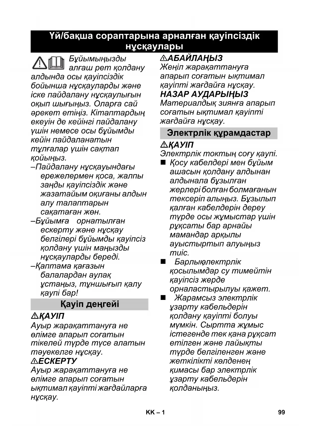 Қауіп деңгейі Электрлік құрамдастар 99KK– 2 Ұзарту кабелінің желілік ашасы мен жалғамасы суға берік болуы керек жəне оларды суға тигізбеу қажет. Жалғама жерде жатпауы тиіс. Кабель барабанын қолданғаныңыз жөн, бұл ашалы розетканың жерден мин. 60 мм. жоғары тұруын қамтамасыз етеді. Ұзартқышты əрқашан кабель барабанына толығымен ораңыз. Желілік кабельді тасымалдауға жəне құрылғыны бекітуге
