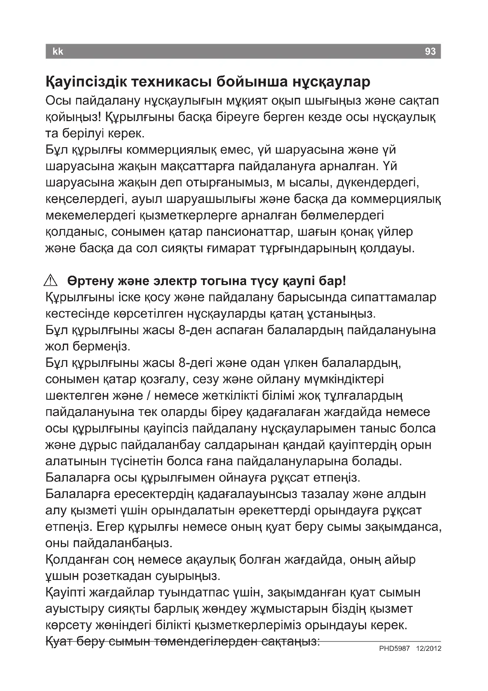 электропитания (напряжение / частота) 220 – 240 В 50 Гц Мощность 2200 Вт93 PHD5987 12/2012 93kk Қауіпсіздік техникасы бойынша нұсқаулар Осы пайдалану нұсқаулығын мұқият оқып шығыңыз және сақтап қойыңыз! Құрылғыны басқа біреуге берген кезде осы нұсқаулық та берілуі керек. Бұл құрылғы коммерциялық емес, үй шаруасына және үй шаруасына жақын мақсаттарға пайдалануға арналған. Үй шаруасына жақын деп отырғанымыз, м ысалы, дүкендердегі, кеңселердегі, ауыл шаруашылығы және басқа да коммерциялық мекемелердегі қызметкерлерге арналған бөлмелердегі қолданыс, сонымен қатар пансионаттар, шағын қонақ үйлер және басқа да сол сияқты ғимарат тұрғындарының қолдауы.