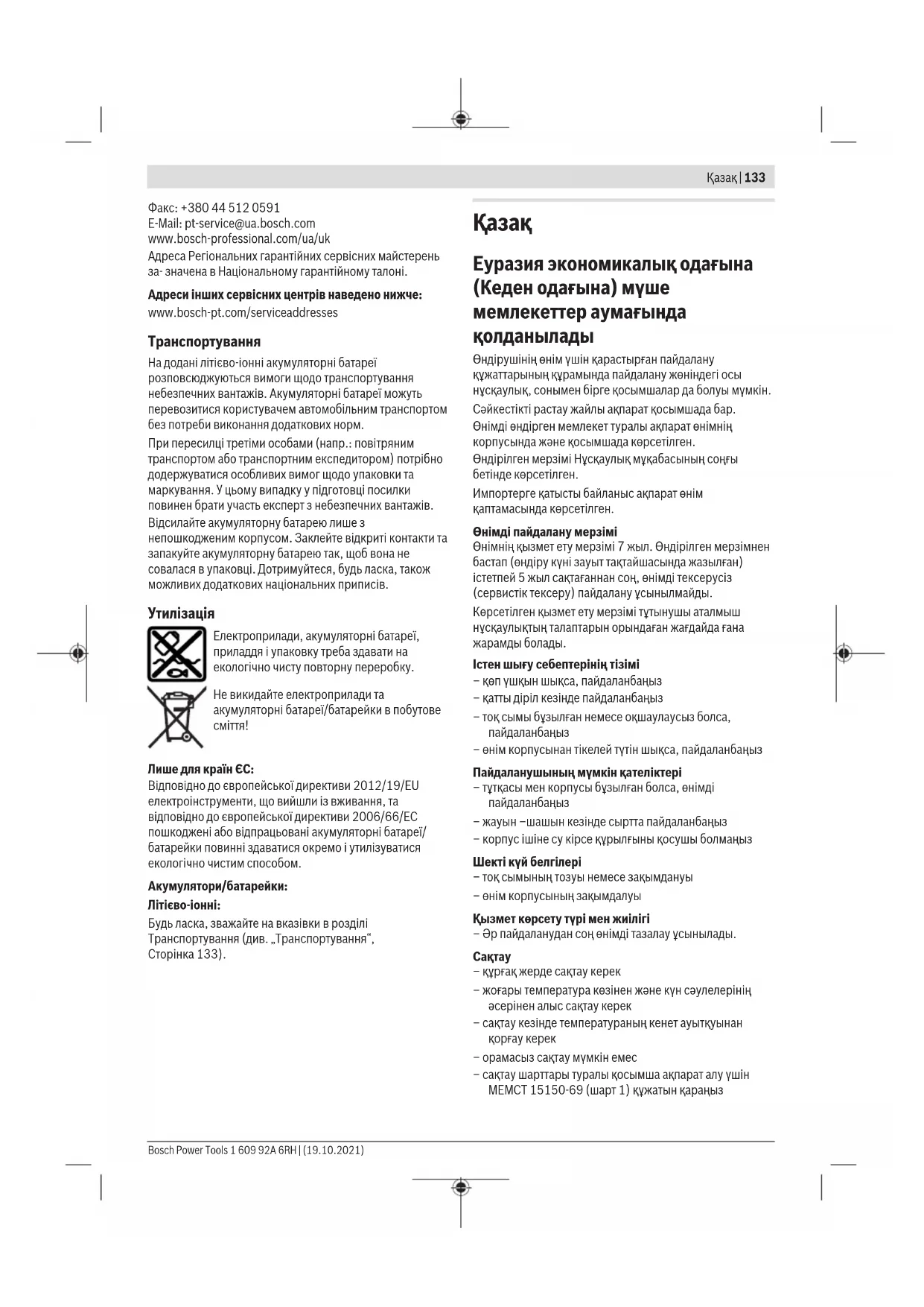 u Қолтұтқалар мен қармау беттерін құрғақ, таза және май мен ластан таза ұстаңыз. Сырғанақ қолтұтқалар мен қармау беттері күтілмеген жағдайларда сенімді қолдану мен бақылауға жол бермейді. Батарея құралын пайдалану және күту u Тек өндіруші сипаттаған зарядтағышмен қайта зарядтаңыз. Батарея жинағының бір түріне сай зарядтағыш басқа батарея жинағымен қолдануда өрт қауіпіне адып келуі мүмкін. u Электр құралдарын тек арнайы тағайындалған батарея жинақтарымен пайдаланыңыз. Кез келген басқа батарея жинақтарын пайдалану жарақаттану мен өрт қауіпіне алып келеді. u Егер батарея жинағы қолдануда болмаса, оны түйреуіш, тиын, кілт, шеге, бұранда немесе басқа кіші метал заттардан ұстаңыз, олар бір терминалдан басқасына байланыс жасауы мүмкін. Батарея терминалдарын қосу күйік немесе өртке алып келуі мүмкін. u Дұрыс емес пайдалануда батареядан сұйықтық ағуы мүмкін, оған тимеңіз. Егер тиіп қалсаңыз, сумен шайып тастаңыз. Егер сұйықтық көзге тисе дәрігерге хабарласыңыз. Батареядан шаққан сұйықтық қозу немесе күйіктерге алып келуі мүмкін. u Зақымдалған немесе өзгертілген батарея жинақтарын пайдаланбаңыз. Зақымдалған немесе өзгертілген батареялар өртке, жарылуға немесе жарақаттуға алып келуі мүмкін кездейсоқ әрекеттерге алып келуі мүмкін. u Батарея жинағын немесе құралын өртке немесе қатты температураға салдырмаңыз. 130°C жоғары температураларда жарылыс болуы мүмкін. u Барлық зарядтау нұсқауларын орындап батарея жинағын нұсқауларда белгіленген температура ауқымынан тыс жағдайда зарядтамаңыз. Дұрыс емес зарядтау немесе белгіленген ауқымнан тыс температурада зарядтау батареяны зақымдап өрт қауіпін жоғарылатуы мүмкін. Bosch Power Tools 1 609 92A 6RH | (19.10.2021)136 | Қазақ Қызмет көрсету u Электр құралына маманды жөндеуші тек бірдей қосалқы бөлшектермен қызмет көрсетуі керек. Бұл электр құралының қауіпсіздігін сақталуын қамтамасыз
