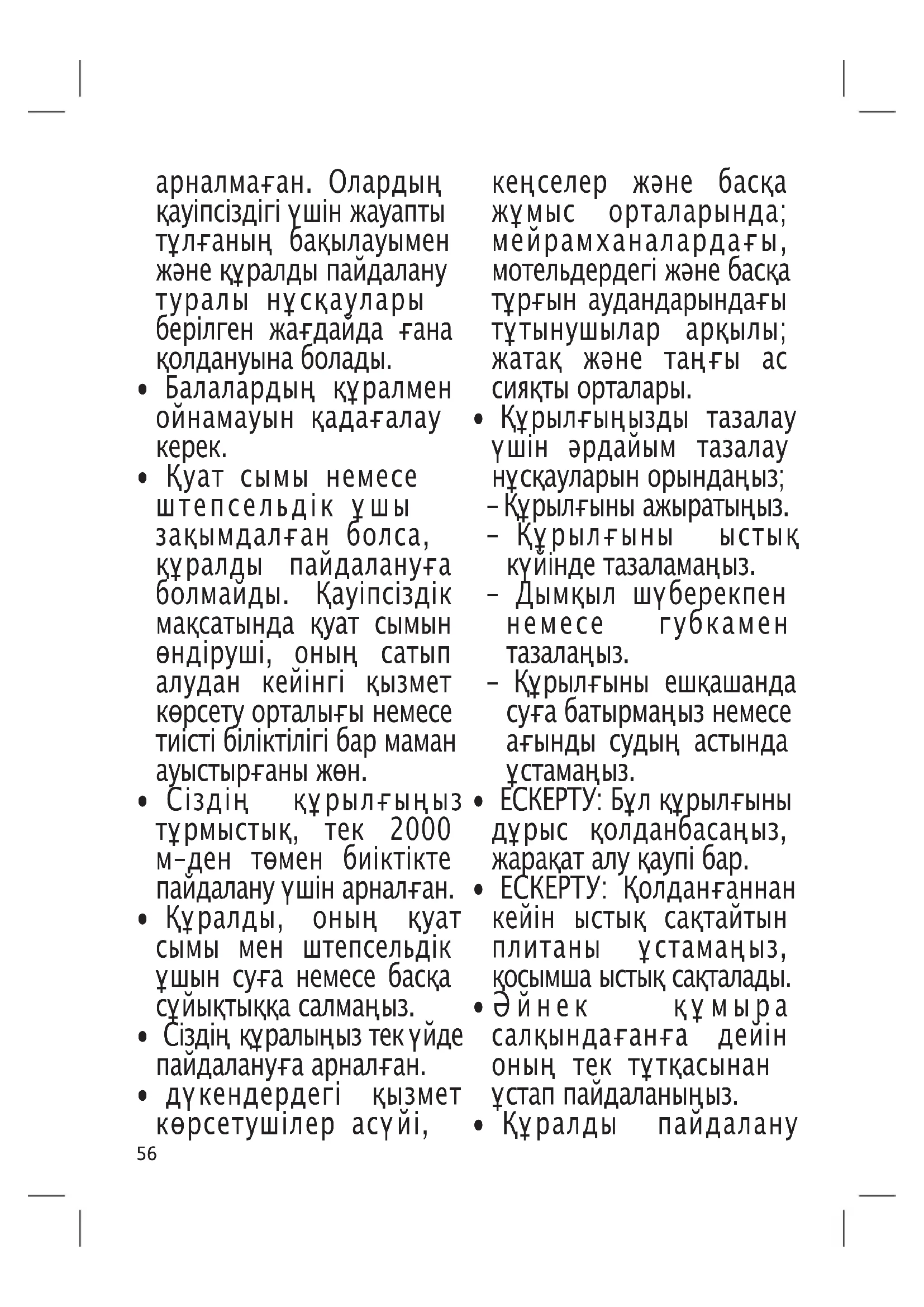 - Бұл құрал физикалық, сезімталдық немесе ойлау қабілеті шектеулі немесе тәжірибесі мен білімі жеткіліксіз тұлғалардың (баларды қоса) қолдануына56 арналмаған. Олардың қауіпсіздігі үшін жауапты тұлғаның бақылауымен және құралды пайдалану туралы нұсқаулары берілген жағдайда ғана қолдануына болады.