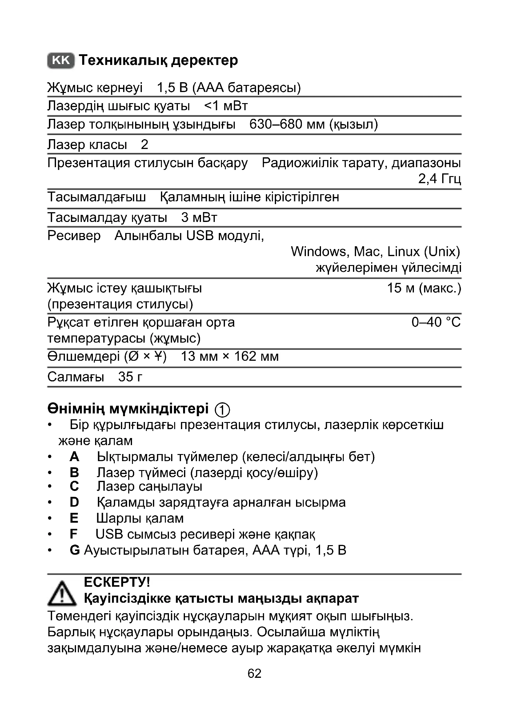 - Бұлөнімпрезентациялардалазерліккөрсеткішретінде және/немесеPowerPoint®,KeyNote,PDFжәнетағыбасқа бағдарламалардаайналдыруқұрылғысыретіндепайдалануға