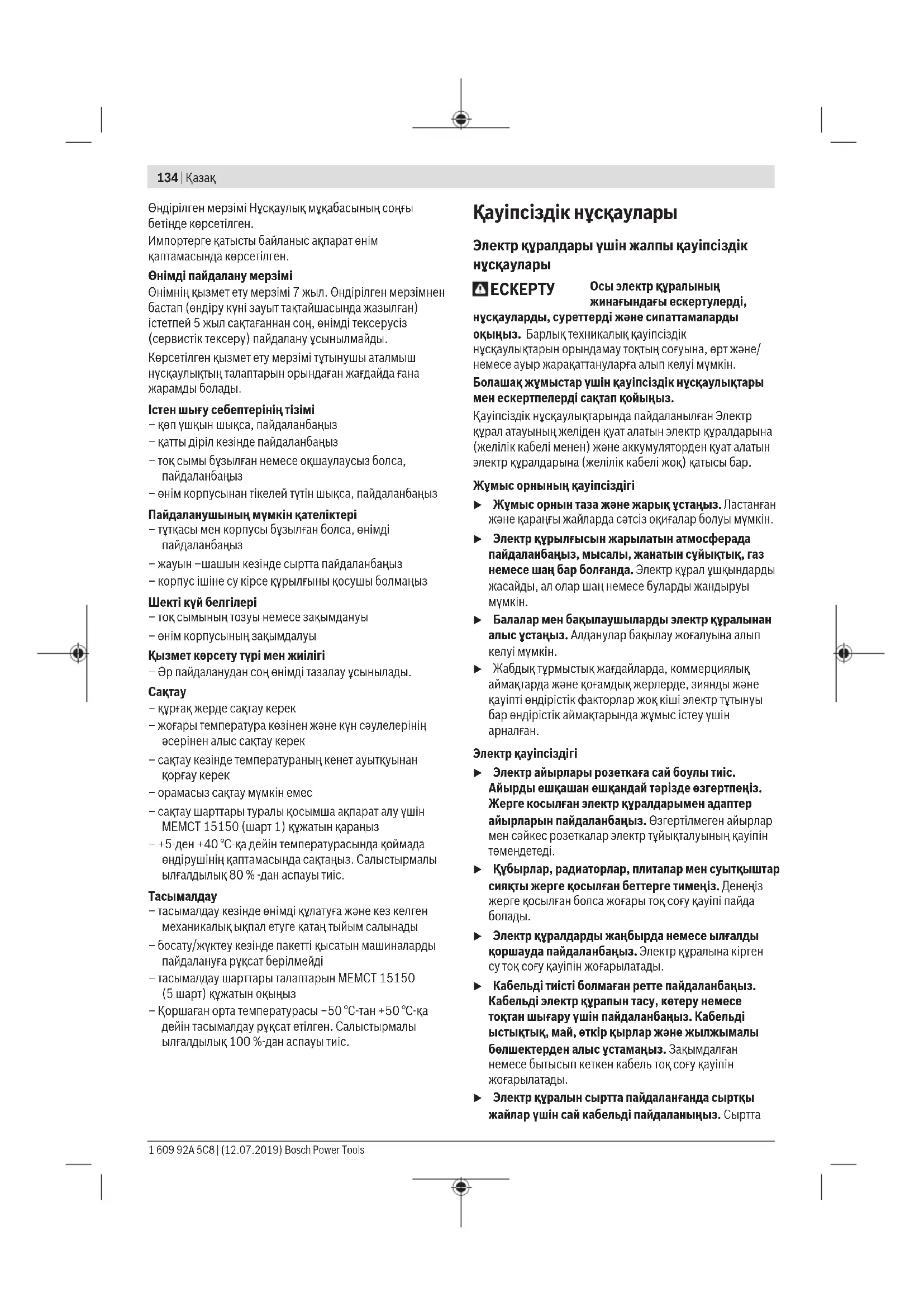 Еуразия экономикалық одағына (Кеден одағына) мүше мемлекеттер аумағында қолданылады Өндірушінің өнім үшін қарастырған пайдалану құжаттарының құрамында пайдалану жөніндегі осы нұсқаулық, сонымен бірге қосымшалар да болуы мүмкін. Сəйкестікті растау жайлы ақпарат қосымшада бар. Өнімді өндірген мемлекет туралы ақпарат өнімнің корпусында жəне қосымшада көрсетілген. Bosch Power Tools 1 609 92A 5C8 | (12.07.2019)134 | Қазақ Өндірілген мерзімі Нұсқаулық мұқабасының соңғы бетінде көрсетілген. Импортерге қатысты байланыс ақпарат өнім қаптамасында көрсетілген. Өнімді пайдалану мерзімі Өнімнің қызмет ету мерзімі 7жыл. Өндірілген мерзімнен бастап (өндіру күні зауыт тақтайшасында жазылған) істетпей 5жыл сақтағаннан соң, өнімді тексерусіз (сервистік тексеру) пайдалану ұсынылмайды. Көрсетілген қызмет ету мерзімі тұтынушы аталмыш нұсқаулықтың талаптарын орындаған жағдайда ғана жарамды болады. Iстен шығу себептерінің тізімі – қөп үшқын шықса, пайдаланбаңыз – қатты діріл кезінде пайдаланбаңыз – тоқ сымы бұзылған немесе оқшаулаусыз болса, пайдаланбаңыз – өнім корпусынан тікелей түтін шықса, пайдаланбаңыз Пайдаланушының мүмкін қателіктері – тұтқасы мен корпусы бұзылған болса, өнімді пайдаланбаңыз – жауын –шашын кезінде сыртта пайдаланбаңыз – корпус ішіне су кірсе құрылғыны қосушы болмаңыз Шекті күй белгілері – тоқ сымының тозуы немесе зақымдануы – өнім корпусының зақымдалуы Қызмет көрсету түрі мен жиілігі – Әр пайдаланудан соң өнімді тазалау ұсынылады.