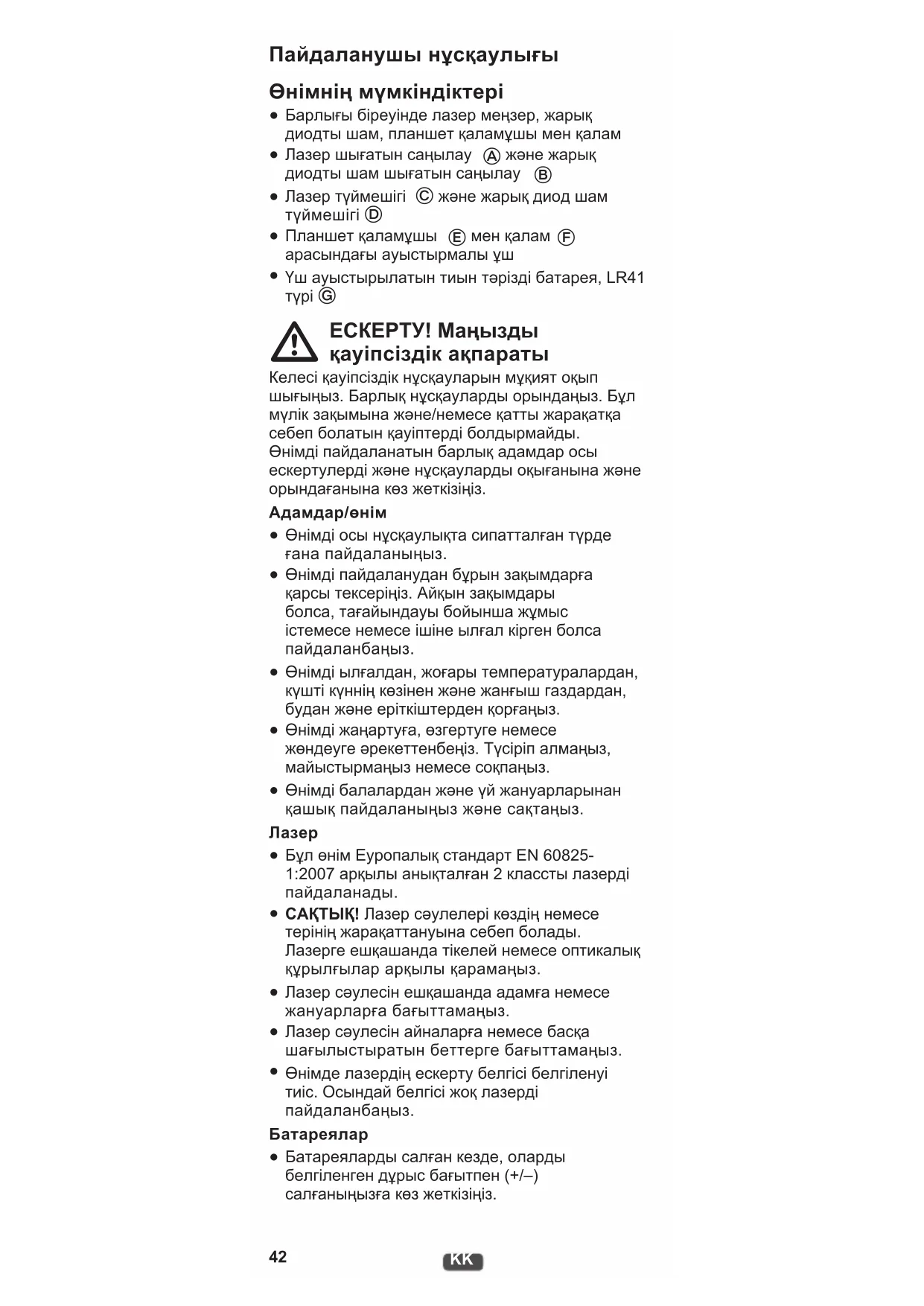 Лазер сәулесін ешқашанда адамға немесе жануарларға бағыттамаңыз.