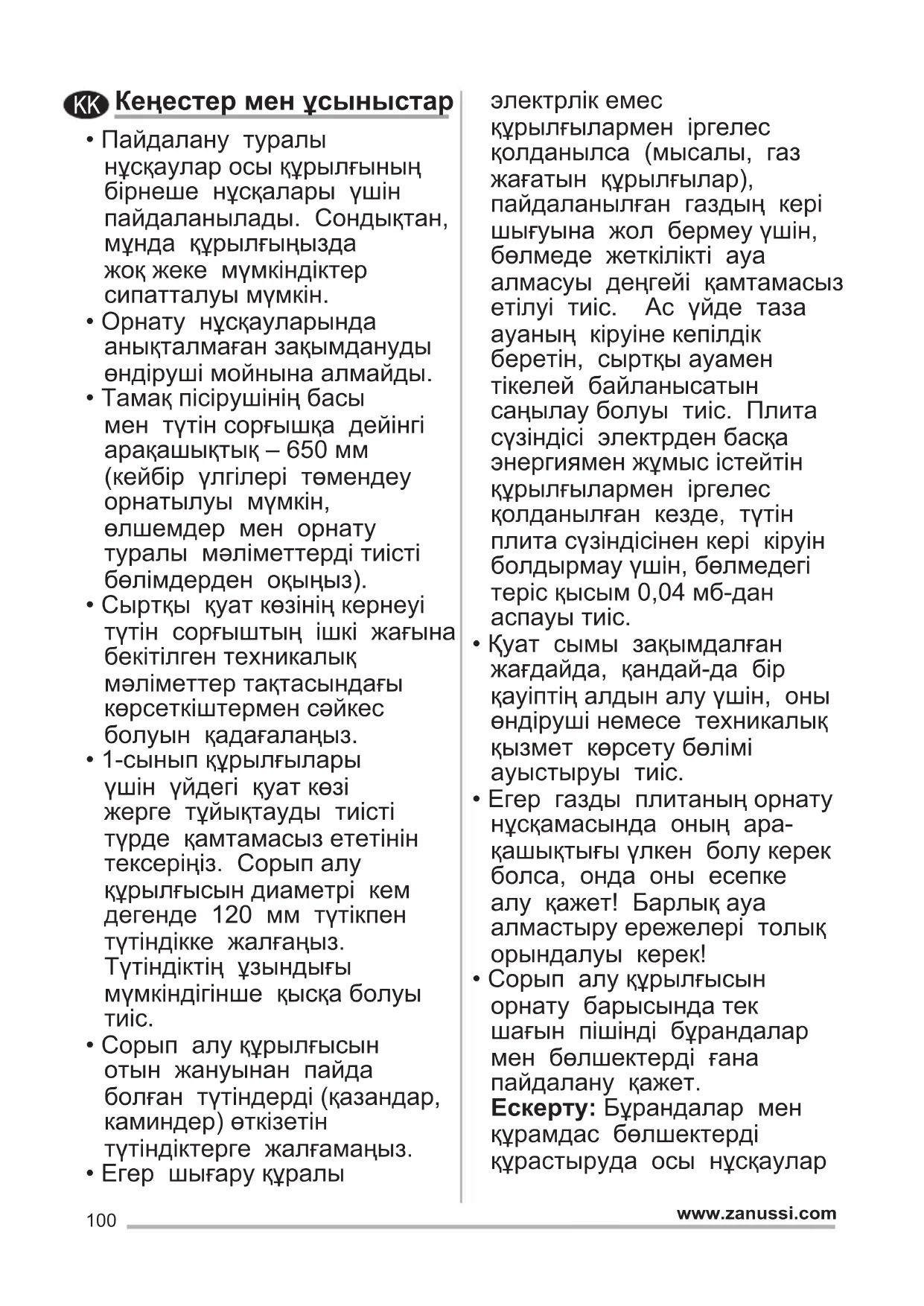 - Сорып алу құрылғысын орнату барысында тек шағын пішінді бұрандалар мен бөлшектерді ғана пайдалану қажет. Ескерту: Бұрандалар мен құрамдас бөлшектерді құрастыруда осы нұсқаулар KK101 www.zanussi.com орындалмаса, электр жүйесінде қауіп тууы мүмкін!