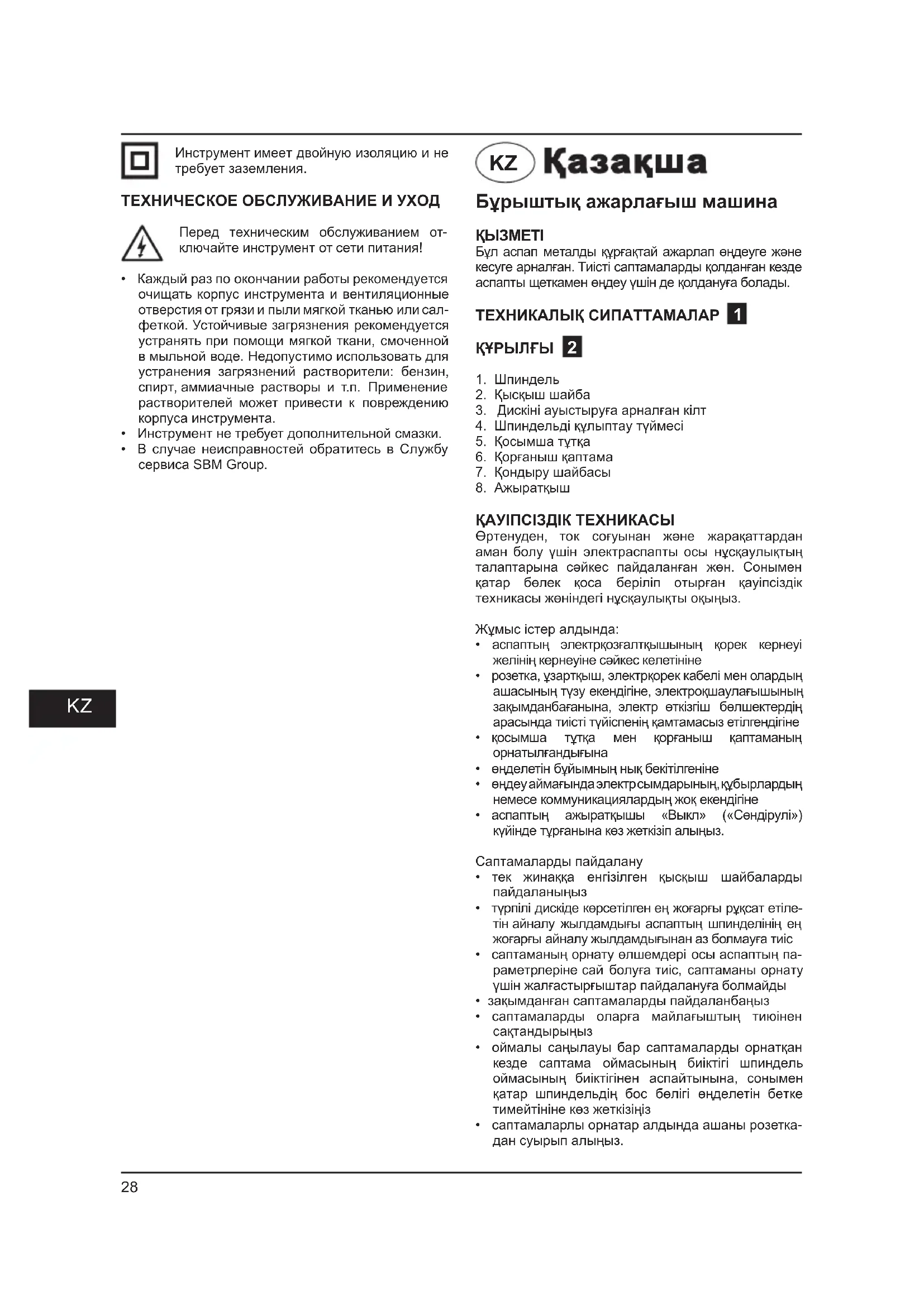 Бұл аспап металды құрғақтай ажарлап өңдеуге жəне кесуге арналған. Тиісті саптамаларды қолданған кезде аспапты щеткамен өңдеу үшін де қолдануға болады. ТЕХНИКАЛЫҚ СИПАТТАМАЛАР 1 ҚҰРЫЛҒЫ 2