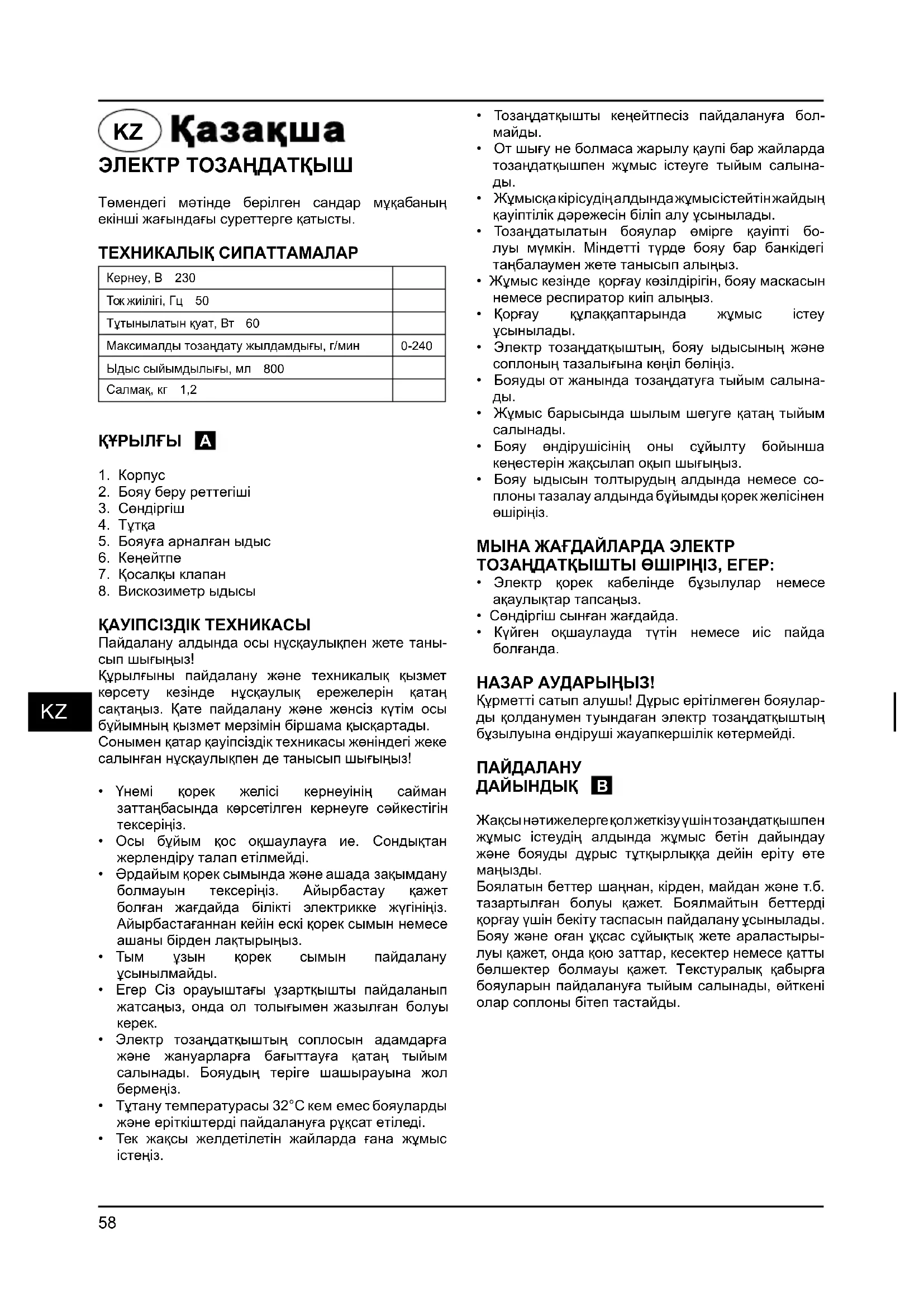 - Электр тозандатқыштың соплосын адамдарға және жануарларға бағыттауға қатаң тыйым салынады. Бояудың теріге шашырауына жол берменіз.