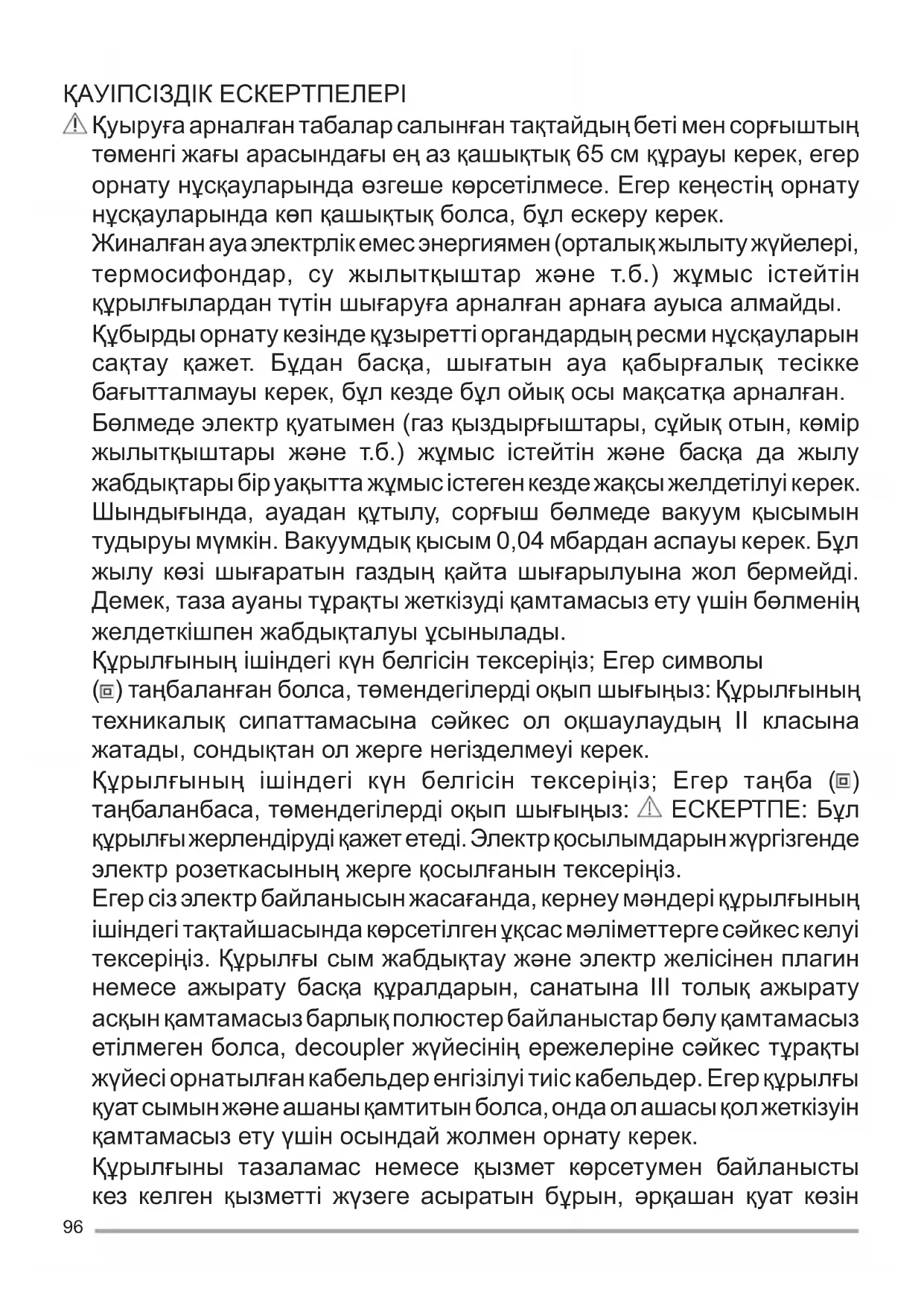 ) таңбаланған болса, төмендегілерді оқып шығыңыз: Құрылғының техникалық сипаттамасына сəйкес ол оқшаулаудың II класына жатады, сондықтан ол жерге негізделмеуі керек. Құрылғының ішіндегі күн белгісін тексеріңіз; Егер таңба ( ) таңбаланбаса, төмендегілерді оқып шығыңыз: ЕСКЕРТПЕ: Бұл құрылғы жерлендіруді қажет етеді. Электр қосылымдарын жүргізгенде электр розеткасының жерге қосылғанын тексеріңіз. Егер сіз электр байланысын жасағанда, кернеу мəндері құрылғының ішіндегі тақтайшасында көрсетілген ұқсас мəліметтерге сəйкес келуі тексеріңіз. Құрылғы сым жабдықтау жəне электр желісінен плагин немесе ажырату басқа құралдарын, санатына III толық ажырату асқын қамтамасыз барлық полюстер байланыстар бөлу қамтамасыз етілмеген болса, decoupler жүйесінің ережелеріне сəйкес тұрақты жүйесі орнатылған кабельдер енгізілуі тиіс кабельдер. Егер құрылғы қуат сымын жəне ашаны қамтитын болса, онда ол ашасы қол жеткізуін қамтамасыз ету үшін осындай жолмен орнату керек. Құрылғыны тазаламас немесе қызмет көрсетумен байланысты кез келген қызметті жүзеге асыратын бұрын, əрқашан қуат көзін97 ажыратыңыз. Қуат сымы зақымдалған болса, онда ол қауіп болдырмау мақсатында біліктілігін бірдей деңгейі өндіруші, қызмет көрсету өкілі немесе тұлға ауыстыруы тиіс. Ескерту: осы Нұсқаулыққа сəйкес бұрандаларды немесе бекіту құрылғысын бекіту емес пе электр əкеп соғуы мүмкін. Құрылғы тапсырмасына сəйкес білікті мамандар орнатылуы тиіс. Құрылғының жанында жалындарды (жалын) тастайтын материалдарды болдырмау керек