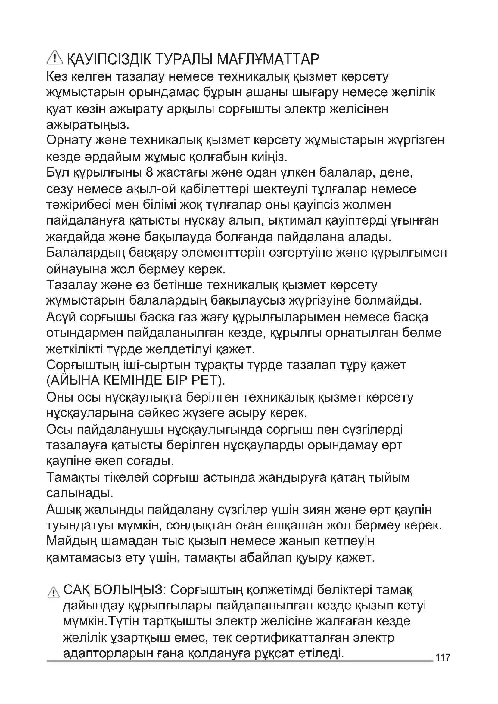 (3.),средна(4.),максимална(5.). ОСВЕТИТЕЛНПРИБОР Аспираторътразполагасосветителна системасъсСВЕТОДИОДИ. СВЕТОДИОДИТЕгарантиратоптимално осветление,до10пътипо-силноот традиционнителампиипозволяват90% икономиянаелектроенергия. Внимание! Негледайтедиректно светлинатанасветодиодите! Заподмянасеобърнетекъмсервизаза техническообслужване.117 ҚАУІПСІЗДІКТУРАЛЫМАҒЛҰМАТТАР Кезкелгентазалаунемесетехникалыққызметкөрсету жұмыстарынорындамасбұрынашанышығарунемесежелілік қуаткөзінажыратуарқылысорғыштыэлектржелісінен ажыратыңыз. Орнатужәнетехникалыққызметкөрсетужұмыстарынжүргізген кездеәрдайымжұмысқолғабынкиіңіз. Бұлқұрылғыны8жастағыжәнеоданүлкенбалалар,дене, сезунемесеақыл-ойқабілеттерішектеулітұлғаларнемесе тәжірибесіменбіліміжоқтұлғаларонықауіпсізжолмен пайдалануғақатыстынұсқауалып,ықтималқауіптердіұғынған жағдайдажәнебақылаудаболғандапайдаланаалады. Балалардыңбасқаруэлементтерінөзгертуінежәнеқұрылғымен ойнауынажолбермеукерек. Тазалаужәнеөзбетіншетехникалыққызметкөрсету жұмыстарынбалалардыңбақылаусызжүргізуінеболмайды. Асүйсорғышыбасқагазжағуқұрылғыларыменнемесебасқа отындарменпайдаланылғанкезде,құрылғыорнатылғанбөлме жеткіліктітүрдежелдетілуіқажет. Сорғыштыңіші-сыртынтұрақтытүрдетазалаптұруқажет (АЙЫНАКЕМІНДЕБІРРЕТ). Оныосынұсқаулықтаберілгентехникалыққызметкөрсету нұсқауларынасәйкесжүзегеасырукерек. Осыпайдаланушынұсқаулығындасорғышпенсүзгілерді тазалауғақатыстыберілгеннұсқаулардыорындамауөрт қаупінеәкепсоғады. Тамақтытікелейсорғышастындажандыруғақатаңтыйым