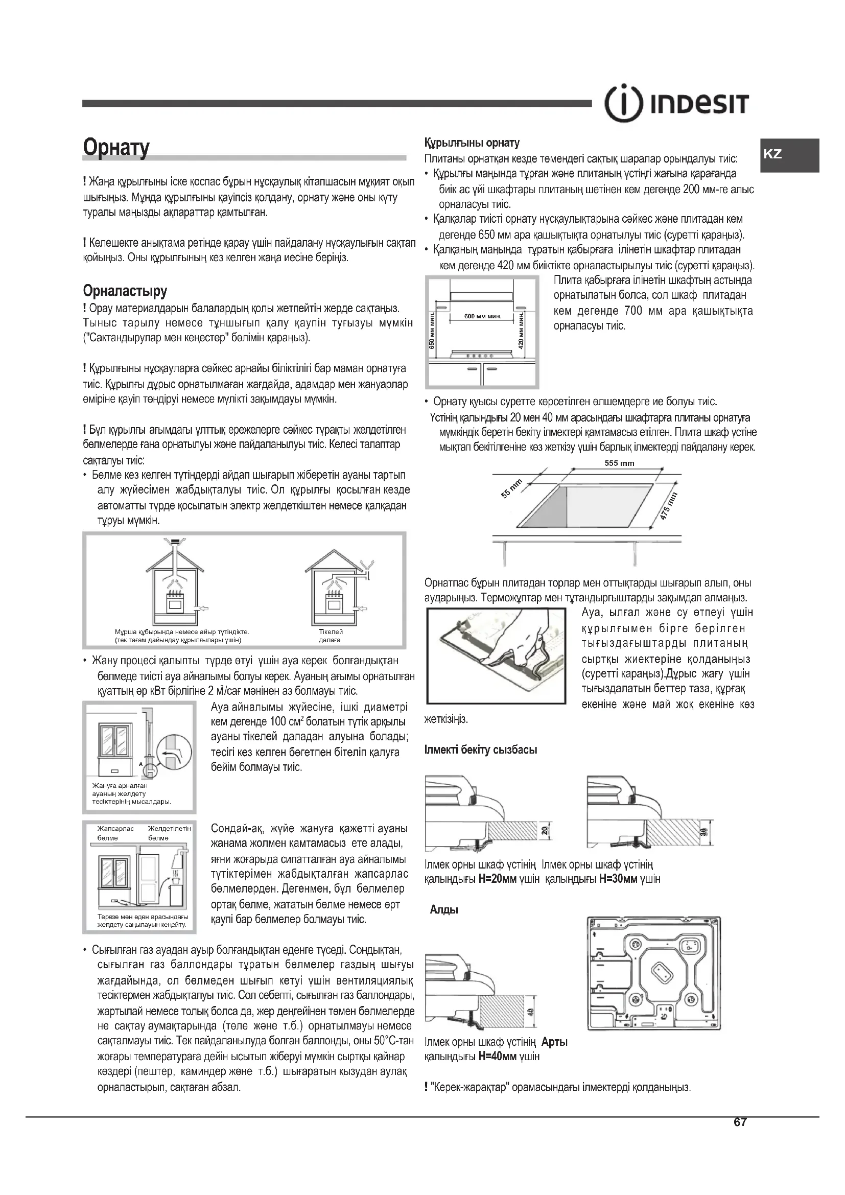 - Газ құрылғылары дұрыс қызмет атқару үшін ауа айналымын ретке келтіру керек. Осы қондырғыларды орнатқан кезде “Орналастыру” параграфында сипатталған талаптар сақталуын тексеріңіз.