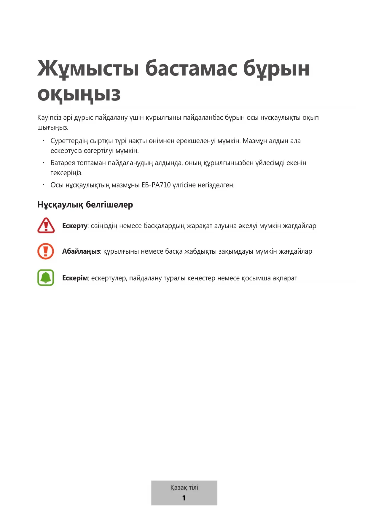 Осы нұсқаулықтың мазмұны EB-PA710 үлгісіне негізделген. Нұсқаулық белгішелер Ескерту: өзіңіздің немесе басқалардың жарақат алуына әкелуі мүмкін жағдайлар Абайлаңыз: құрылғыны немесе басқа жабдықты зақымдауы мүмкін жағдайлар Ескерім: ескертулер, пайдалану туралы кеңестер немесе қосымша ақпарат