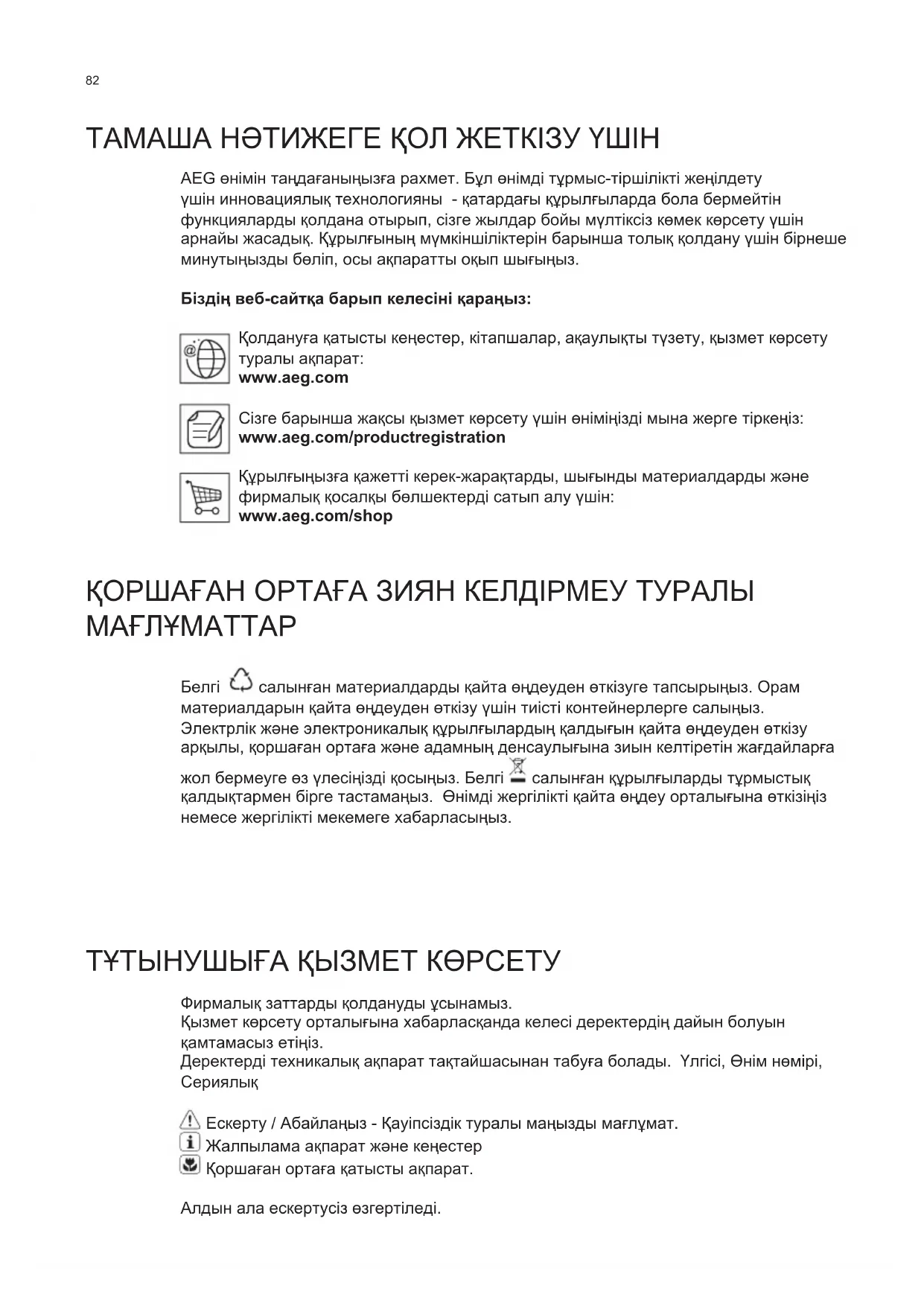 Във всеки случай е необходимо да подменяте филтъра с активен въглен на всеки четири месеца или когато индикаторът за засищане на филтрите показва, че е необходимо.82 ТАМАША НƏТИЖЕГЕ ҚОЛ ЖЕТКІЗУ ҮШІН AEG өнімін таңдағаныңызға рахмет. Бұл өнімді тұрмыс-тіршілікті жеңілдету үшін инновациялық технологияны - қатардағы құрылғыларда бола бермейтін функцияларды қолдана отырып, сізге жылдар бойы мүлтіксіз көмек көрсету үшін арнайы жасадық. Құрылғының мүмкіншіліктерін барынша толық қолдану үшін бірнеше минутыңызды бөліп, осы ақпаратты оқып шығыңыз. Біздің веб-сайтқа барып келесіні қараңыз: Қолдануға қатысты кеңестер, кітапшалар, ақаулықты түзету, қызмет көрсету туралы ақпарат: www.aeg.com Сізге барынша жақсы қызмет көрсету үшін өніміңізді мына жерге тіркеңіз: www.aeg.com/productregistration Құрылғыңызға қажетті керек-жарақтарды, шығынды материалдарды жəне фирмалық қосалқы бөлшектерді сатып алу үшін: www.aeg.com/shop ҚОРШАҒАН ОРТАҒА ЗИЯН КЕЛДІРМЕУ ТУРАЛЫ МАҒЛҰМАТТАР Белгі салынған материалдарды қайта өңдеуден өткізуге тапсырыңыз. Орам материалдарын қайта өңдеуден өткізу үшін тиісті контейнерлерге салыңыз. Электрлік жəне электроникалық құрылғылардың қалдығын қайта өңдеуден өткізу арқылы, қоршаған ортаға жəне адамның денсаулығына зиын келтіретін жағдайларға жол бермеуге өз үлесіңізді қосыңыз. Белгі салынған құрылғыларды тұрмыстық қалдықтармен бірге тастамаңыз. Өнімді жергілікті қайта өңдеу орталығына өткізіңіз немесе жергілікті мекемеге хабарласыңыз. ТҰТЫНУШЫҒА ҚЫЗМЕТ КӨРСЕТУ Фирмалық заттарды қолдануды ұсынамыз. Қызмет көрсету орталығына хабарласқанда келесі деректердің дайын болуын қамтамасыз етіңіз. Деректерді техникалық ақпарат тақтайшасынан табуға болады. Үлгісі, Өнім нөмірі,