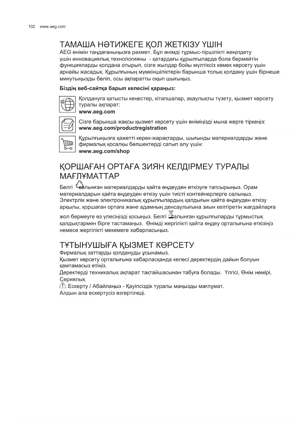 ТАМАША НӘТИЖЕГЕ ҚОЛ ЖЕТКІЗУ ҮШІН AEG өнімін таңдағаныңызға рахмет. Бұл өнімді тұрмыс-тіршілікті жеңілдету үшін инновациялық технологияны - қатардағы құрылғыларда бола бермейтін функцияларды қолдана отырып, сізге жылдар бойы мүлтіксіз көмек көрсету үшін арнайы жасадық. Құрылғының мүмкіншіліктерін барынша толық қолдану үшін бірнеше минутыңызды бөліп, осы ақпаратты оқып шығыңыз. Біздің веб-сайтқа барып келесіні қараңыз: Қолдануға қатысты кеңестер, кітапшалар, ақаулықты түзету, қызмет көрсету туралы ақпарат: www.aeg.com Сізге барынша жақсы қызмет көрсету үшін өніміңізді мына жерге тіркеңіз: www.aeg.com/productregistration Құрылғыңызға қажетті керек-жарақтарды, шығынды материалдарды және фирмалық қосалқы бөлшектерді сатып алу үшін: www.aeg.com/shop ҚОРШАҒАН ОРТАҒА ЗИЯН КЕЛДІРМЕУ ТУРАЛЫ МАҒЛҰМАТТАР Белгі салынған материалдарды қайта өңдеуден өткізуге тапсырыңыз. Орам материалдарын қайта өңдеуден өткізу үшін тиісті контейнерлерге салыңыз. Электрлік және электроникалық құрылғылардың қалдығын қайта өңдеуден өткізу арқылы, қоршаған ортаға және адамның денсаулығына зиын келтіретін жағдайларға жол бермеуге өз үлесіңізді қосыңыз. Белгі салынған құрылғыларды тұрмыстық қалдықтармен бірге тастамаңыз. Өнімді жергілікті қайта өңдеу орталығына өткізіңіз немесе жергілікті мекемеге хабарласыңыз. ТҰТЫНУШЫҒА ҚЫЗМЕТ КӨРСЕТУ Фирмалық заттарды қолдануды ұсынамыз. Қызмет көрсету орталығына хабарласқанда келесі деректердің дайын болуын қамтамасыз етіңіз. Деректерді техникалық ақпарат тақтайшасынан табуға болады. Үлгісі, Өнім нөмірі,