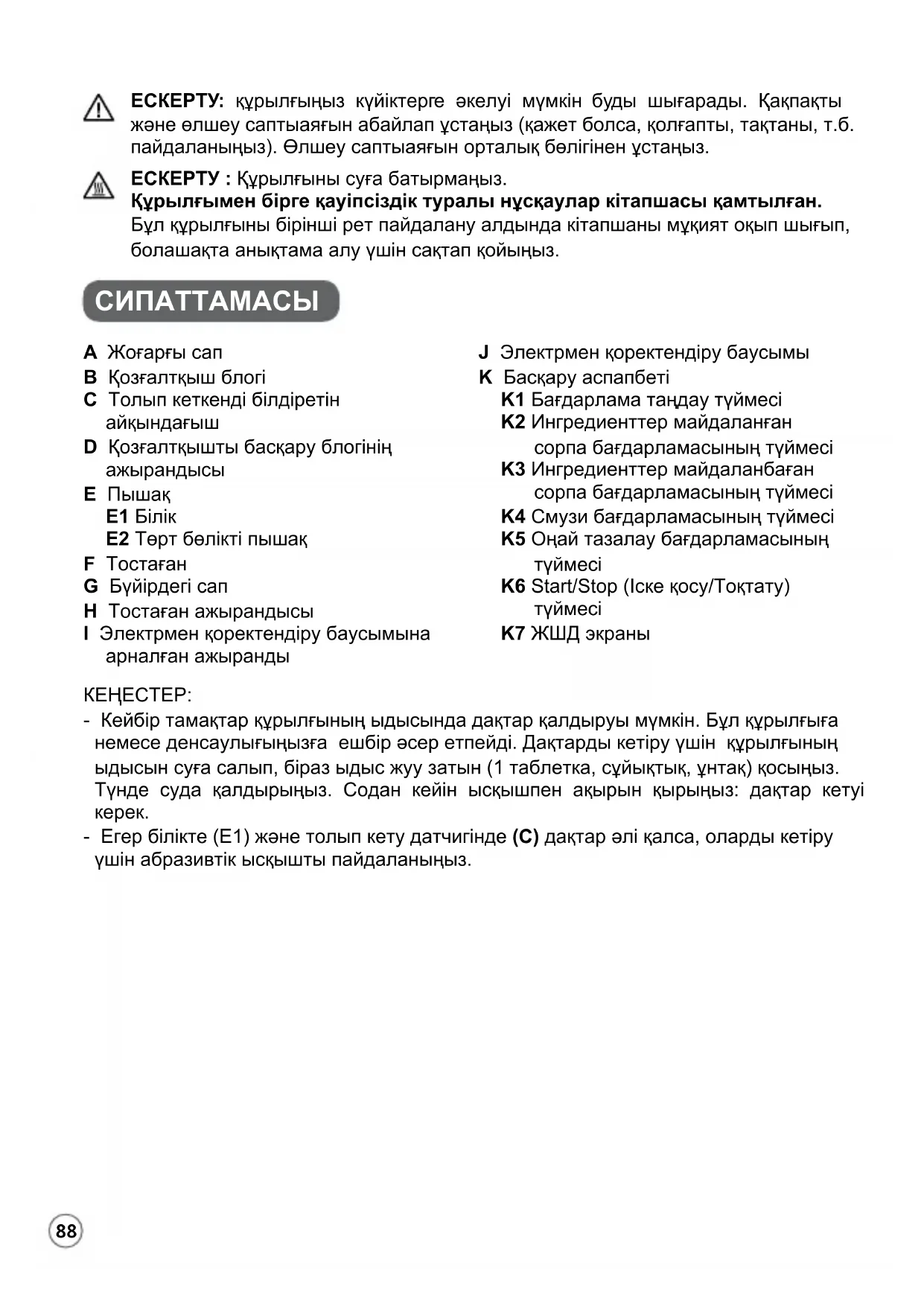 - Егер білікте (E1) және толып кету датчигінде (C) дақтар әлі қалса, оларды кетіру үшін абразивтік ысқышты пайдаланыңыз. ЕСКЕРТУ: құрылғыңыз күйіктерге әкелуі мүмкін буды шығарады. Қақпақты және өлшеу саптыаяғын абайлап ұстаңыз (қажет болса, қолғапты, тақтаны, т.б. пайдаланыңыз). Өлшеу саптыаяғын орталық бөлігінен ұстаңыз. ЕСКЕРТУ : Құрылғыны суға батырмаңыз. Құрылғымен бірге қауіпсіздік туралы нұсқаулар кітапшасы қамтылған. Бұл құрылғыны бірінші рет пайдалану алдында кітапшаны мұқият оқып шығып, болашақта анықтама алу үшін сақтап қойыңыз.89