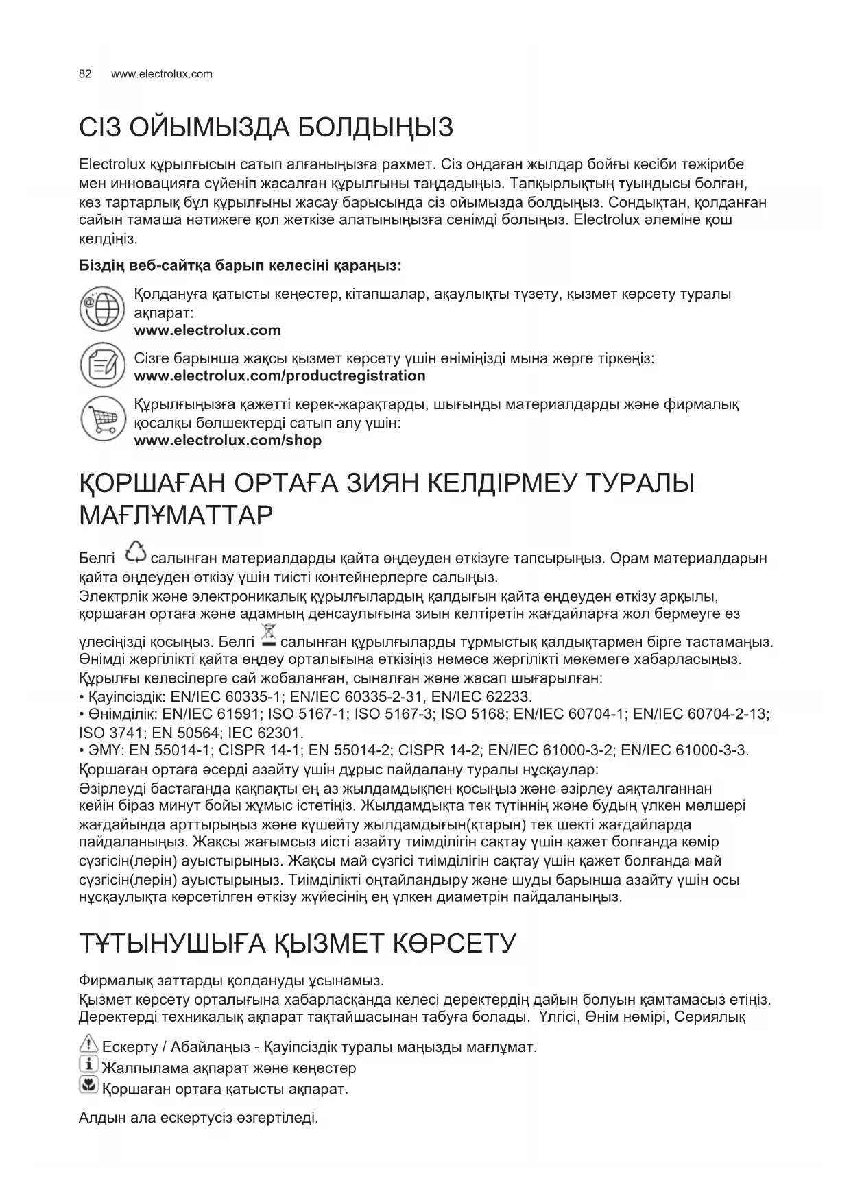 www.electrolux.com Сізге барынша жақсы қызмет көрсету үшін өніміңізді мына жерге тіркеңіз: www.electrolux.com/productregistration Құрылғыңызға қажетті керек-жарақтарды, шығынды материалдарды жəне фирмалық қосалқы бөлшектерді сатып алу үшін: www.electrolux.com/shop ҚОРШАҒАН ОРТАҒА ЗИЯН КЕЛДІРМЕУ ТУРАЛЫ МАҒЛҰМАТТАР Белгі салынған материалдарды қайта өңдеуден өткізуге тапсырыңыз. Орам материалдарын қайта өңдеуден өткізу үшін тиісті контейнерлерге салыңыз. Электрлік жəне электроникалық құрылғылардың қалдығын қайта өңдеуден өткізу арқылы, қоршаған ортаға жəне адамның денсаулығына зиын келтіретін жағдайларға жол бермеуге өз үлесіңізді қосыңыз. Белгі салынған құрылғыларды тұрмыстық қалдықтармен бірге тастамаңыз. Өнімді жергілікті қайта өңдеу орталығына өткізіңіз немесе жергілікті мекемеге хабарласыңыз. Құрылғы келесілерге сай жобаланған, сыналған жəне жасап шығарылған: