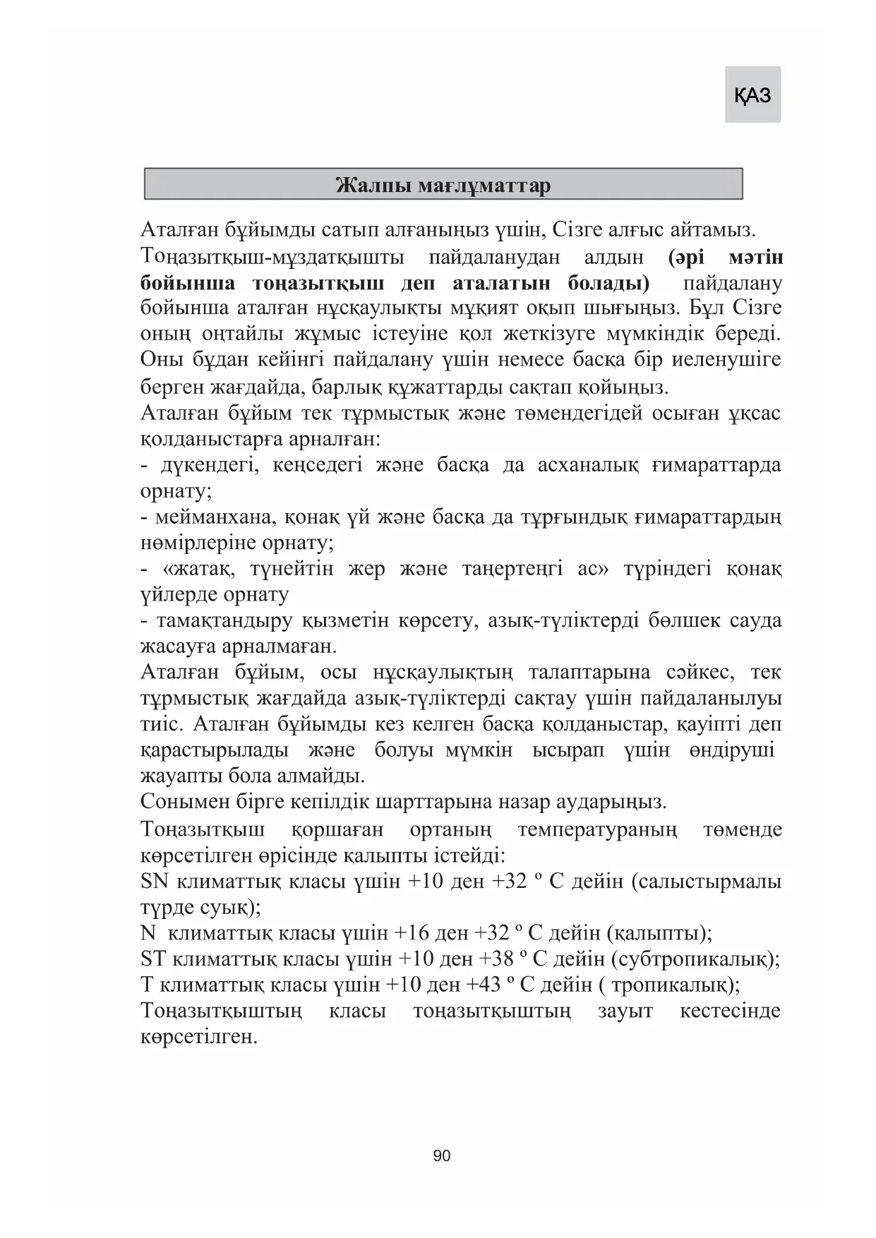 - мейманхана, қонақ үй жəне басқа да тұрғындық ғимараттардың нөмірлеріне орнату; - «жатақ, түнейтін жер жəне таңертеңгі ас» түріндегі қонақ үйлерде орнату - тамақтандыру қызметін көрсету, азық-түліктерді бөлшек сауда жасауға арналмаған. Аталған бұйым, осы нұсқаулықтың талаптарына сəйкес, тек тұрмыстық жағдайда азық-түліктерді сақтау үшін пайдаланылуы тиіс. Аталған бұйымды кез келген басқа қолданыстар, қауіпті деп қарастырылады жəне болуы мүмкін ысырап үшін өндіруші жауапты бола алмайды. Сонымен бірге кепілдік шарттарына назар аударыңыз. Тоңазытқыш қоршаған ортаның температураның төменде көрсетілген өрісінде қалыпты істейді: SN климаттық класы үшін +10 ден +32 º С дейін (салыстырмалы түрде суық); N климаттық класы үшін +16 ден +32 º С дейін (қалыпты); SТ климаттық класы үшін +10 ден +38 º С дейін (субтропикалық); Т климаттық класы үшін +10 ден +43 º С дейін ( тропикалық); Тоңазытқыштың класы тоңазытқыштың зауыт кестесінде көрсетілген.