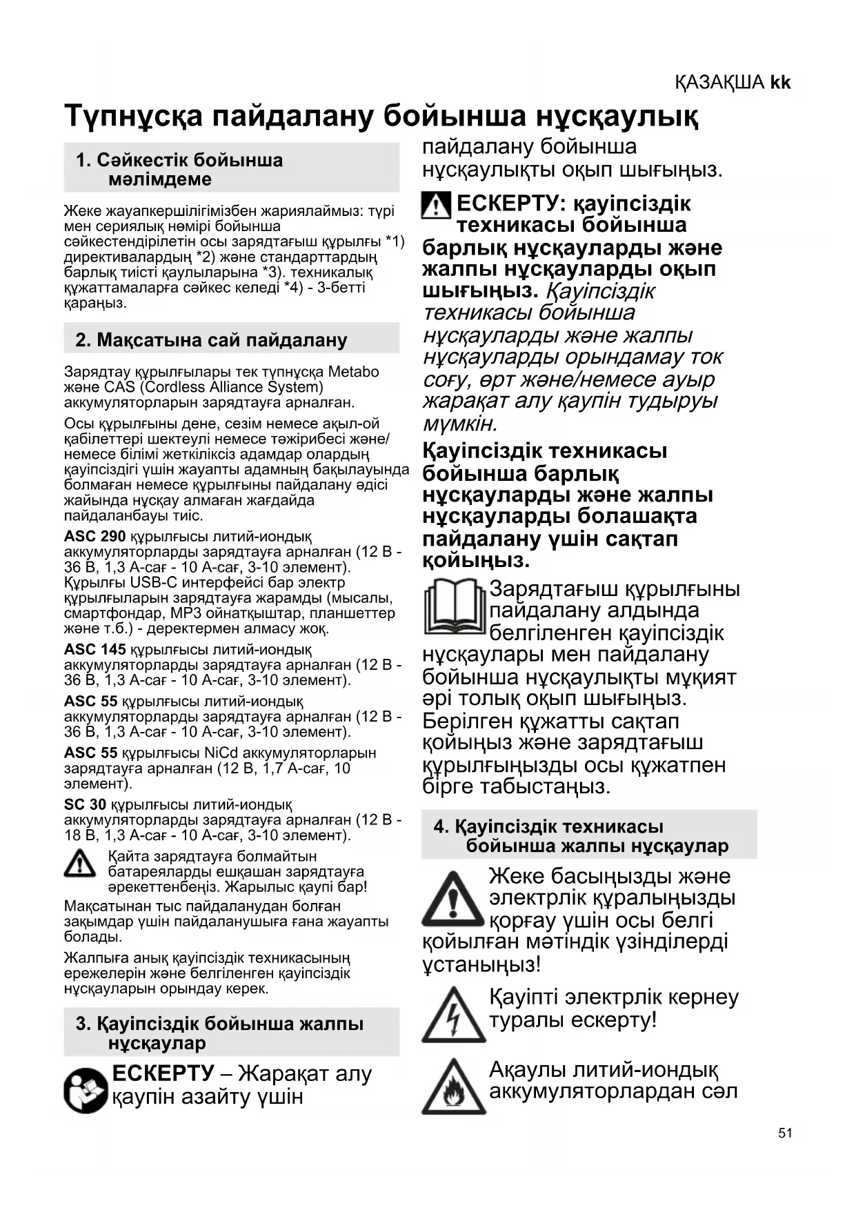 Зарядтау құрылғылары тек түпнұсқа Metabo және CAS (Cordless Alliance System) аккумуляторларын зарядтауға арналған. Осы құрылғыны дене, сезім немесе ақыл-ой қабілеттері шектеулі немесе тәжірибесі және/ немесе білімі жеткіліксіз адамдар олардың қауіпсіздігі үшін жауапты адамның бақылауында болмаған немесе құрылғыны пайдалану әдісі жайында нұсқау алмаған жағдайда пайдаланбауы тиіс. ASC 290 құрылғысы литий-иондық аккумуляторларды зарядтауға арналған (12 В - 36 В, 1,3 А-сағ - 10 А-сағ, 3-10 элемент). Құрылғы USB-C интерфейсі бар электр құрылғыларын зарядтауға жарамды (мысалы, смартфондар, MP3 ойнатқыштар, планшеттер және т.б.) - деректермен алмасу жоқ. ASC 145 құрылғысы литий-иондық аккумуляторларды зарядтауға арналған (12 В - 36 В, 1,3 А-сағ - 10 А-сағ, 3-10 элемент). ASC 55 құрылғысы литий-иондық аккумуляторларды зарядтауға арналған (12 В - 36 В, 1,3 А-сағ - 10 А-сағ, 3-10 элемент). ASC 55 құрылғысы NiCd аккумуляторларын зарядтауға арналған (12 В, 1,7 А-сағ, 10