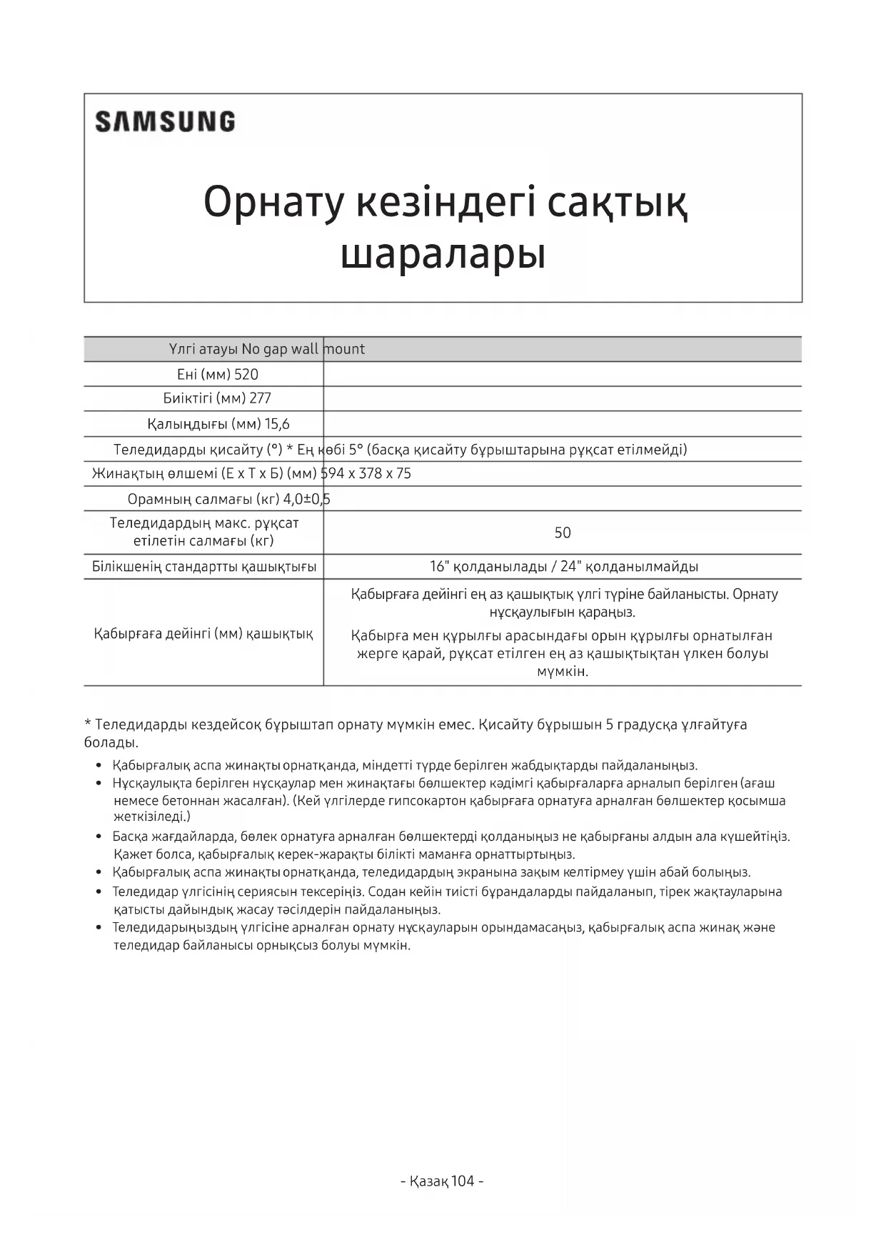 - Теледидарыңыздың үлгісіне арналған орнату нұсқауларын орындамасаңыз, қабырғалық аспа жинақ және теледидар байланысы орнықсыз болуы мүмкін.- Қазақ 104 - - Қазақ 105 -