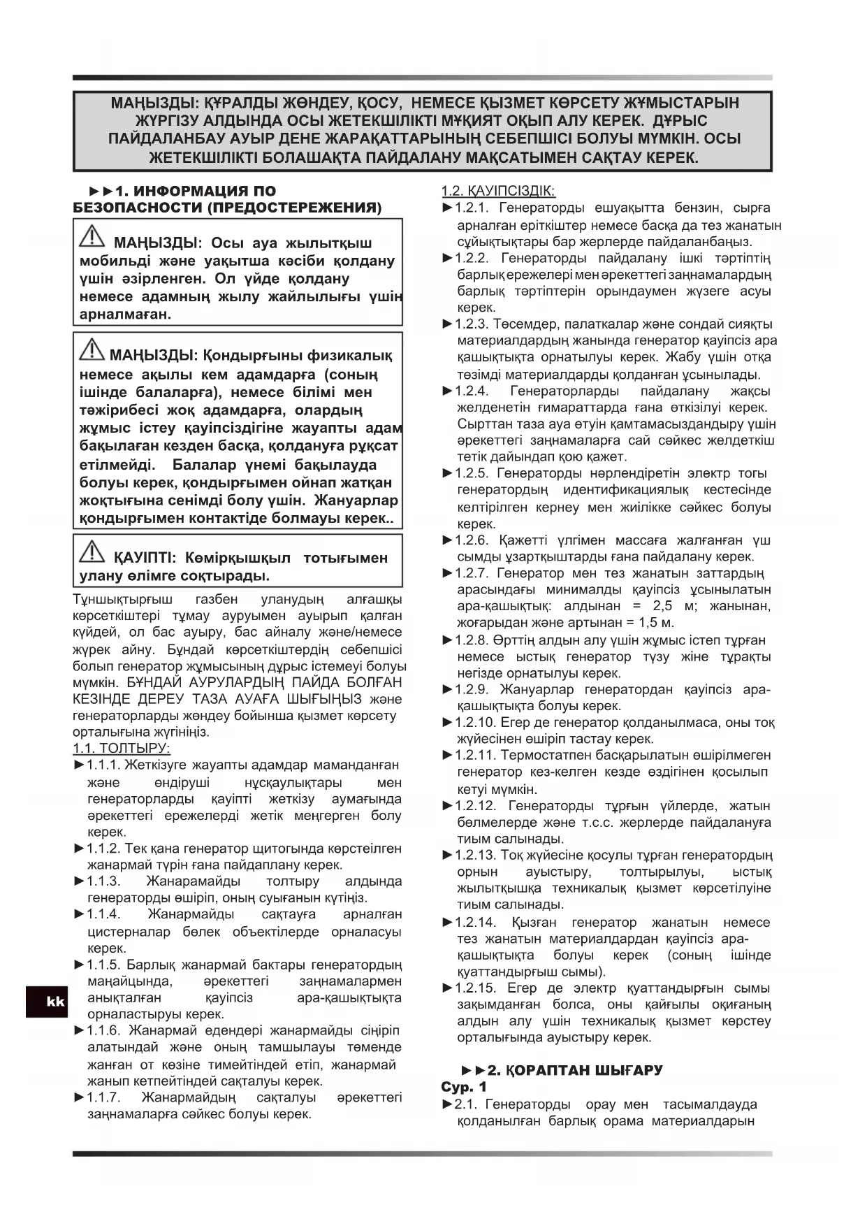 МАҢЫЗДЫ: ҚҰРАЛДЫ ЖӨНДЕУ, ҚОСУ, НЕМЕСЕ ҚЫЗМЕТ КӨРСЕТУ ЖҰМЫСТАРЫН ЖҮРГІЗУ АЛДЫНДА ОСЫ ЖЕТЕКШІЛІКТІ МҰҚИЯТ ОҚЫП АЛУ КЕРЕК. ДҰРЫС ПАЙДАЛАНБАУ АУЫР ДЕНЕ ЖАРАҚАТТАРЫНЫҢ СЕБЕПШІСІ БОЛУЫ МҮМКІН. ОСЫ ЖЕТЕКШІЛІКТІ БОЛАШАҚТА ПАЙДАЛАНУ МАҚСАТЫМЕН САҚТАУ КЕРЕК. ►►1. ИНФОРМАЦИЯ ПО БЕЗОПАСНОСТИ (ПРЕДОСТЕРЕЖЕНИЯ) МАҢЫЗДЫ: Осы ауа жылытқыш мобильді және уақытша кәсіби қолдану үшін әзірленген. Ол үйде қолдану немесе адамның жылу жайлылығы үшін арналмаған. МАҢЫЗДЫ: Қондырғыны физикалық немесе ақылы кем адамдарға (соның ішінде балаларға), немесе білімі мен тәжірибесі жоқ адамдарға, олардың жұмыс істеу қауіпсіздігіне жауапты адам бақылаған кезден басқа, қолдануға рұқсат етілмейді. Балалар үнемі бақылауда болуы керек, қондырғымен ойнап жатқан жоқтығына сенімді болу үшін. Жануарлар қондырғымен контактіде болмауы керек.. ҚАУІПТІ: Көмірқышқыл тотығымен улану өлімге соқтырады. Тұншықтырғыш газбен уланудың алғашқы көрсеткіштері тұмау ауруымен ауырып қалған күйдей, ол бас ауыру, бас айналу және/немесе жүрек айну. Бұндай көрсеткіштердің себепшісі болып генератор жұмысының дұрыс істемеуі болуы мүмкін. БҰНДАЙ АУРУЛАРДЫҢ ПАЙДА БОЛҒАН КЕЗІНДЕ ДЕРЕУ ТАЗА АУАҒА ШЫҒЫҢЫЗ және генераторларды жөндеу бойынша қызмет көрсету орталығына жүгініңіз. 1.1. ТОЛТЫРУ: ►1.1.1. Жеткізуге жауапты адамдар маманданған және өндіруші нұсқаулықтары мен генераторларды қауіпті жеткізу аумағында әрекеттегі ережелерді жетік меңгерген болу