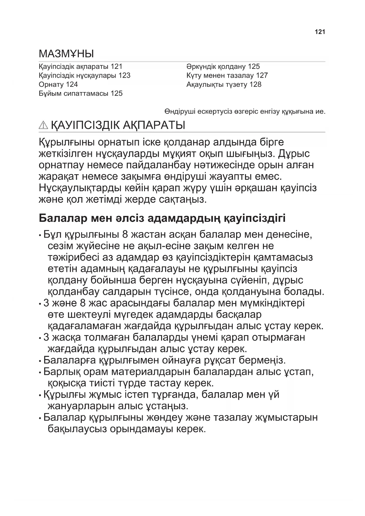 - Балалар құрылғыны жөндеу және тазалау жұмыстарын бақылаусыз орындамауы керек. 121Қауіпсіздік туралы жалпы ақпарат
