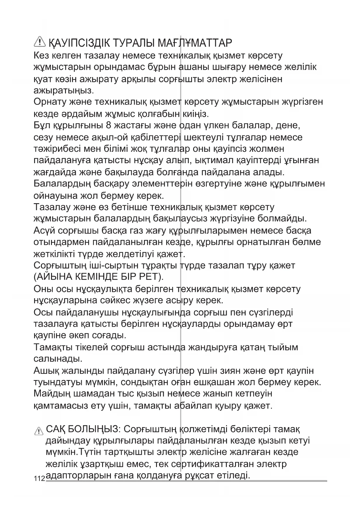 (3.),средна(4.),максимална(5.). ОСВЕТИТЕЛНПРИБОР Аспираторътразполагасосветителна системасъсСВЕТОДИОДИ. СВЕТОДИОДИТЕгарантиратоптимално осветление,до10пътипо-силноот традиционнителампиипозволяват90% икономиянаелектроенергия. Внимание! Негледайтедиректно светлинатанасветодиодите! Заподмянасеобърнетекъмсервизаза техническообслужване.112 ҚАУІПСІЗДІКТУРАЛЫМАҒЛҰМАТТАР Кезкелгентазалаунемесетехникалыққызметкөрсету жұмыстарынорындамасбұрынашанышығарунемесежелілік қуаткөзінажыратуарқылысорғыштыэлектржелісінен ажыратыңыз. Орнатужәнетехникалыққызметкөрсетужұмыстарынжүргізген кездеәрдайымжұмысқолғабынкиіңіз. Бұлқұрылғыны8жастағыжәнеоданүлкенбалалар,дене, сезунемесеақыл-ойқабілеттерішектеулітұлғаларнемесе тәжірибесіменбіліміжоқтұлғаларонықауіпсізжолмен пайдалануғақатыстынұсқауалып,ықтималқауіптердіұғынған жағдайдажәнебақылаудаболғандапайдаланаалады. Балалардыңбасқаруэлементтерінөзгертуінежәнеқұрылғымен ойнауынажолбермеукерек. Тазалаужәнеөзбетіншетехникалыққызметкөрсету жұмыстарынбалалардыңбақылаусызжүргізуінеболмайды. Асүйсорғышыбасқагазжағуқұрылғыларыменнемесебасқа отындарменпайдаланылғанкезде,құрылғыорнатылғанбөлме жеткіліктітүрдежелдетілуіқажет. Сорғыштыңіші-сыртынтұрақтытүрдетазалаптұруқажет (АЙЫНАКЕМІНДЕБІРРЕТ). Оныосынұсқаулықтаберілгентехникалыққызметкөрсету нұсқауларынасәйкесжүзегеасырукерек. Осыпайдаланушынұсқаулығындасорғышпенсүзгілерді тазалауғақатыстыберілгеннұсқаулардыорындамауөрт қаупінеәкепсоғады. Тамақтытікелейсорғышастындажандыруғақатаңтыйым