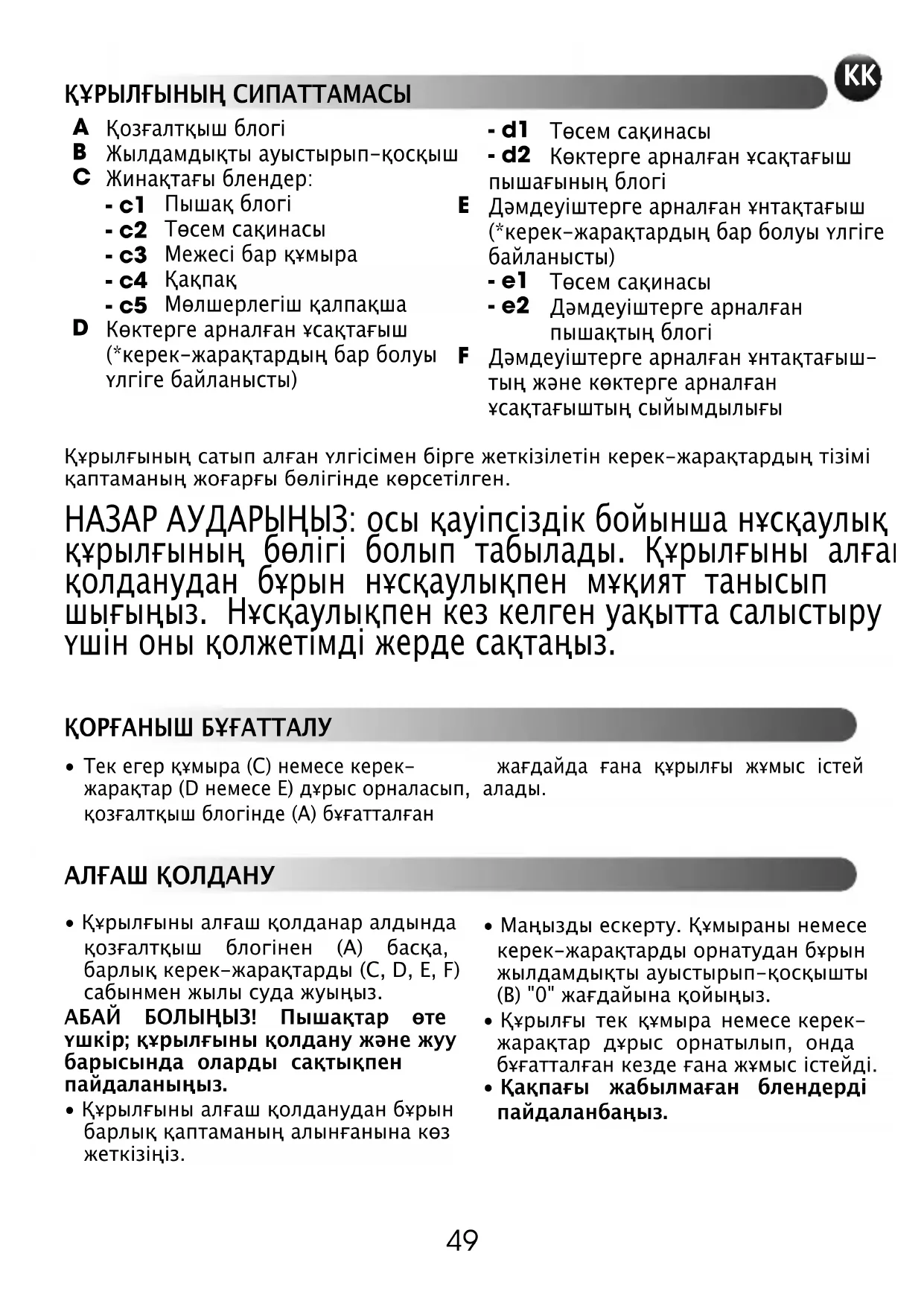 - d1 Төсем сақинасы - d2 Көктерге арналған ұсақтағыш пышағының блогі Дәмдеуіштерге арналған ұнтақтағыш (*керек-жарақтардың бар болуы үлгіге байланысты) - e1 Төсем сақинасы - e2 Дәмдеуіштерге арналған пышақтың блогі Дәмдеуіштерге арналған ұнтақтағыш- тың және көктерге арналған ұсақтағыштың сыйымдылығы Құрылғының сатып алған үлгісімен бірге жеткізілетін керек-жарақтардың тізіміқаптаманың жоғарғы бөлігінде көрсетілген. НАЗАР АУДАРЫҢЫЗ: осы қауіпсіздік бойынша нұсқаулық құрылғының бөлігі болып табылады. Құрылғыны алғаш қолданудан бұрын нұсқаулықпен мұқият танысып шығыңыз. Нұсқаулықпен кез келген уақытта салыстыру үшін оны қолжетімді жерде сақтаңыз. ҚОРҒАНЫШ БҰҒАТТАЛУ АЛҒАШ ҚОЛДАНУ