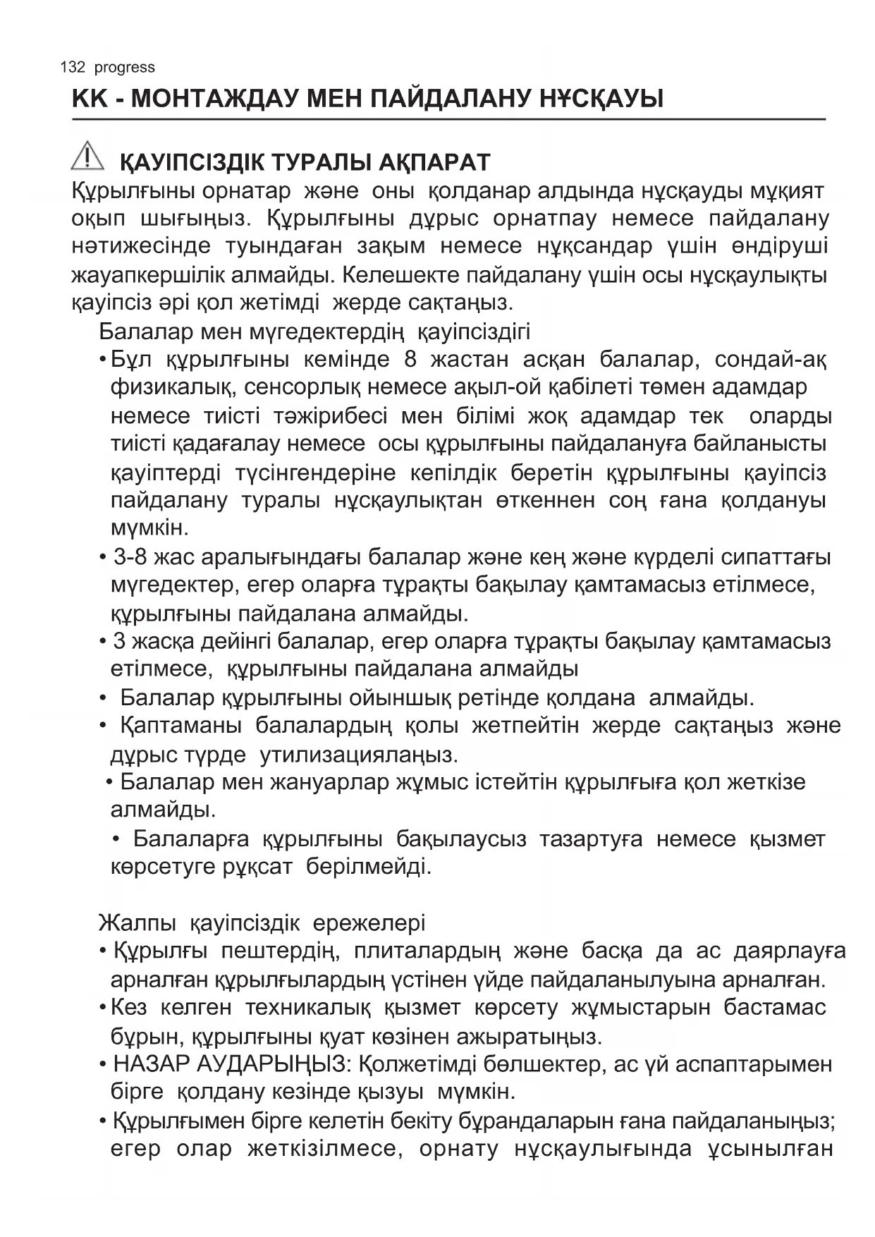 - Құрылғының бетін тазалау үшін бумен тазалағыштарды, су бүріккішін, абразивті тазалағыштарды немесе өткір металл қырғыштарды қолданбаңыз. Тек бейтарап жуғыш заттарды134 progress пайдаланыңыз.