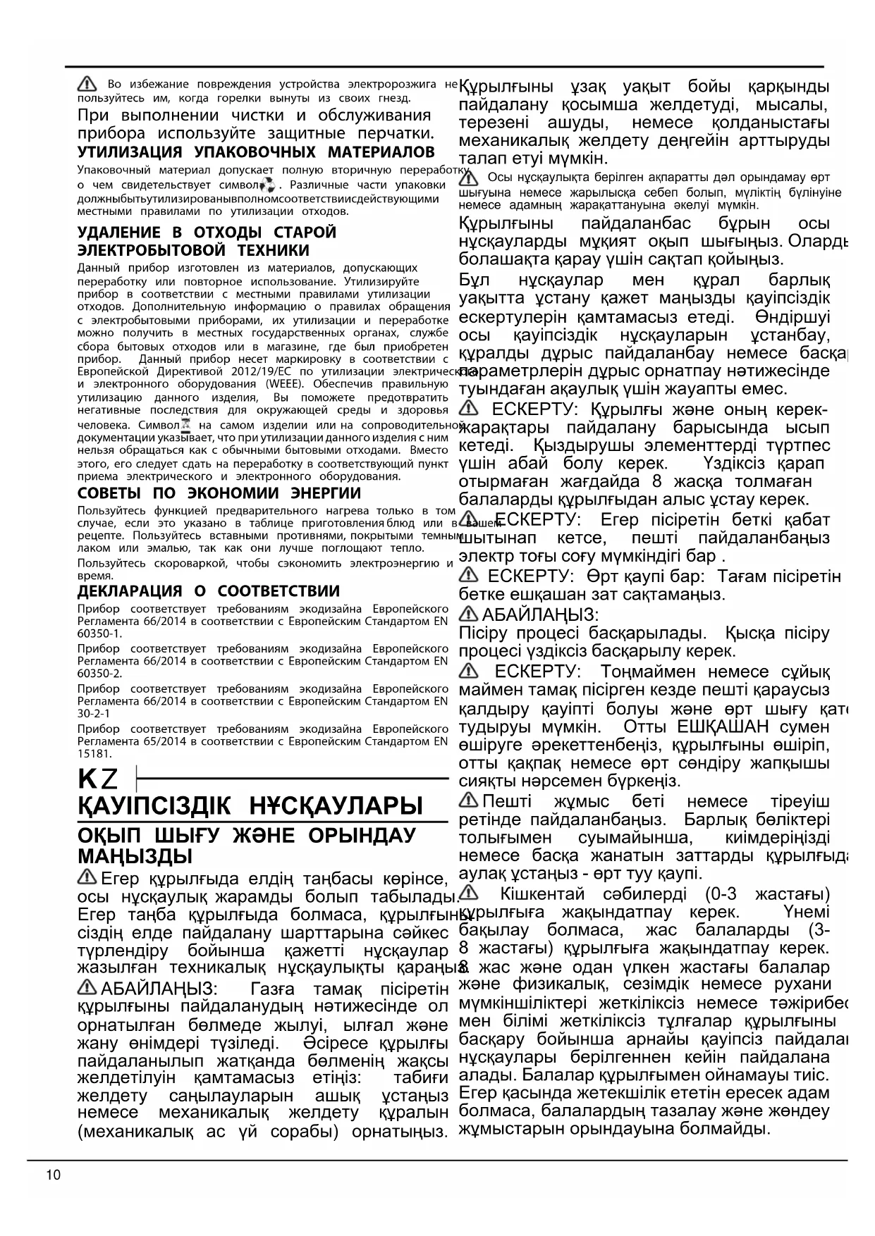 ЕСКЕРТУ: Шамын алмастырар алдында құрылғыны өшіріңіз - электр тоғымен зақымдану қаупі бар. Электрлік оталдыру құралын бұзып алмас үшін, оттықтар өздерінің ұясында тұрмаған кезде оны пайдаланбаңыз. Тазалау және қызмет көрсету үшін, қорғанысш қолғаптарын киіңіз. ОРАМ МАТЕРИАЛДАРЫН ТАСТАУ Орам материалы 100% қайта өңделеді және ол қайта өңдеу таңбасымен белгіленген . Орамның әр түрлі бөліктері қоқысты тастауға рұқсат беретін жергілікті орган ережелеріне толығымен сәйкес және жауапкершілікпен өткізілуі қажет. ПАЙДАЛАНЫЛЫП БОЛҒАН ТҰРМЫСТЫҚ ҚҰРЫЛҒЫЛАРДЫ ҚОҚЫСҚА ТАСТАУ Бұл құрылғы қайта өңделмелі немесе қайта қолданбалы материалдардан жасалған. Оны жергілікті қалдықты тастау ережелеріне сәйкес қоқысқа тастаңыз. Тұрмыстықэлектр құрылғыларын қолдану, қалпына келтіру және қайтапайдалануға тапсыру бойынша қосымша ақпарат алу үшінқұзыретті жергілікті билік органына, тұрмыстық қалдықтарды жинау қызметіне немесе құрылғы сатып алынған дүкенге хабарласыңыз. Бұл құрал электрлік және электрондық жабдықты қоқысқа тастау (WEEE) бойынша 2012/19/EU Еуропалық директивасына сай белгіленген. Бұл өнімнен дұрыс арылуарқылы қоршаған ортаға және адамдардың денсаулығына теріс әсердің салдарының алдын алуға көмектесесіз. Құрылғыдағы немесе онымен берілген құжаттамадағыбелгісі бұлқұрылғының үй қоқыстарымен бірге тасталмай, электрондықжәне электрлік құрылғыларды қоқысқа тастау ережесіне сайарнайы жинау орнына өткізу керектігін көрсетеді. ҚУАТ ҮНЕМДЕУ ТУРАЛЫ КЕҢЕСТЕР Пісіру кестесінде немесе рецептте көрсетілген жағдайда ғана пешті алдын ала қыздырыңыз. Тек қара лак немесе эмаль жағылған пісіру қалыптарын пайдаланыңыз, себебі олар қызуды жақсырақ сіңіреді.Қуат пен уақытты үнемдеу үшін қысыммен пісіру ыдысынпайдаланыңыз. СӘЙКЕСТІЛІК ДЕКЛАРАЦИЯСЫ Бұл құрылғы EN 60350-1 Еуропалық стандартына сәйкес, 66/2014 Еуропалық ереженің экодизайн талаптарына сәйкескеледі. Бұл құрылғы EN 60350-2 Еуропалық стандартына сәйкес, №66/2014 Еуропалық ереженің экодизайн талаптарына сәйкескеледі.Бұл құрылғы EN 30-2-1 Еуропалық стандартына сәйкес,№66/2014 Еуропалық ереженің экодизайн талаптарына сәйкескеледіБұл құрылғы EN 15181 Еуропалық стандартына сәйкес, 65/2014Еуропалық ереженің экодизайн талаптарына сәйкес келеді.