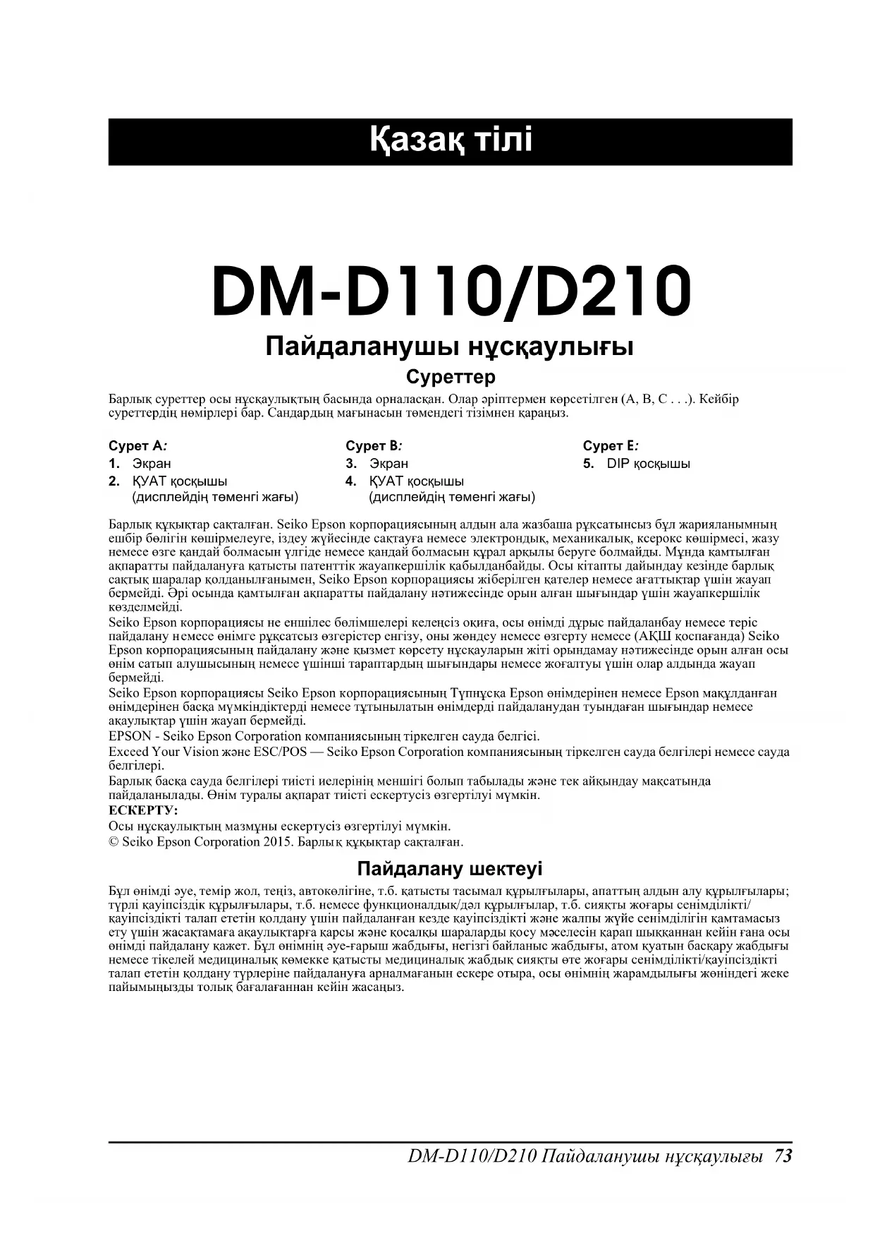 Осы нұсқаулықтың мазмұны ескертусіз өзгертілуі мүмкін. © Seiko Epson Corporation 2015. Барлы қ құқықтар сақталған. Пайдалану шектеуі Бұл өнімді əуе, темір жол, теңіз, автокөлігіне, т.б. қатысты тасымал құрылғылары, апаттың алдын алу құрылғылары; түрлі қауіпсіздік құрылғылары, т.б. немесе функционалдық/дəл құрылғылар, т.б. сияқты жоғары сенімділікті/ қауіпсіздікті талап ететін қолдану үшін пайдаланған кезде қауіпсіздікті жəне жалпы жүйе сенімділігін қамтамасыз ету үшін жасақтамаға ақаулықтарға қарсы жəне қосалқы шараларды қо су мəселесін қарап шыққаннан кейін ғана осы өнімді пайдалану қажет. Бұл өнімнің əуе-ғарыш жабдығы, негізгі байланыс жабдығы, атом қуатын басқару жабдығы немесе тікелей медициналық көмекке қатысты медициналық жабдық сияқты өте жоғары сенімділікті/қауіпсіздікті талап ететін қолдану түрлеріне пайдалануға арналмағанын ескере отыра, осы өнімнің жарамдылығы жөніндегі жеке пайымыңызды толық бағалағаннан кейін ж