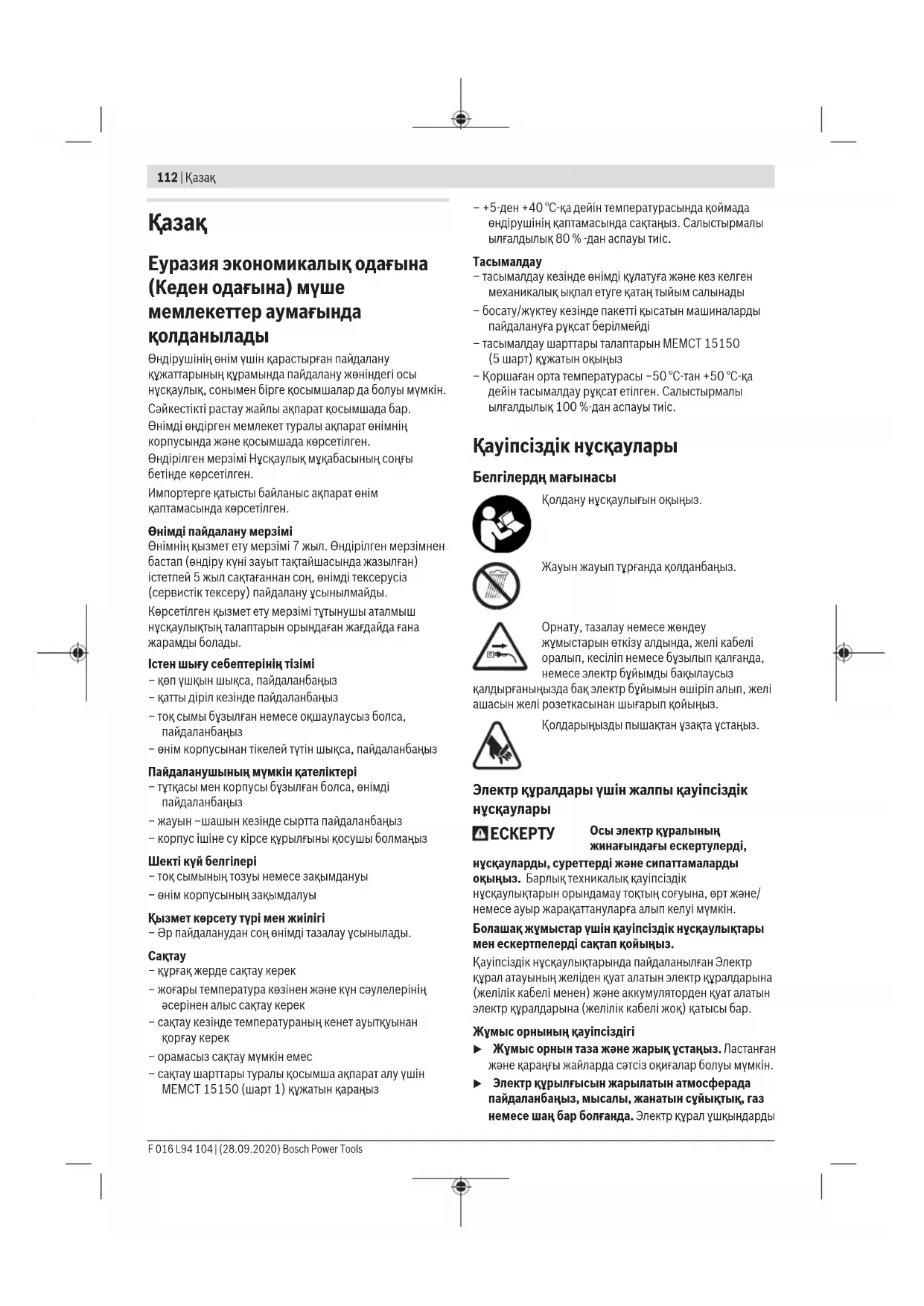 u Кездейсоқ іске қосылудың алдын алу. Тоқ көзіне және/немесе батареялар жинағына қосудан алдын, құралды көтеру немесе тасудан алдын өшіргіш өшік күйде болуына көз жеткізіңіз. Электр құралын саусақты өшіргішке қойып тасу немесе қосқышы қосулы электр құралын тоққа қосу сәтсіз оқиғаға алып келуі мүмкін. u Электр құралын қосудан алдын келген реттеу сынасын немесе кілтті алып қойыңыз. Электр құралының айналатын бөлігінде қалған кілт немесе сына жеке жарақаттануға алып келуі мүмкін. u Көп күш істетпеңіз. Әрдайым тиісті таяныш пен тең салмақытылқты сақтаңыз. Бұл күтілмеген жағдайларда электр құралдың бақылануын сақтайды. u Тиісті киім киіңіз. Бос киім мен әшекейлерді киймеңіз. Шашыңыз бен киімдерді жылжымалы бөлшектерден алыс ұстаңыз. Бос киімдер, әшекейлер немесе ұзын шаш жылжымалы бөлшектер арқылы тартылуы мүмкін. u Егер шаң шығарып жинау жабдықтарына қосу құрылғылары берліген болса, онда олар қосулы болуына және тиісті ретте қолдануына көз жеткізіңіз. Шаң жинауды пайдалану шаңға байланысты зияндарды кемейтеді. u Аспаптарды жиі пайдаланып жақсы білгеннен соң масайрап кетпей қауіпсіздік принциптерін елемей отырмаңыз. Абайсыз әрекет секунд ішінде ауыр жарақаттануға алып келуі мүмкін. u НАЗАР АУДАРЫҢЫЗ! Энергиямен жабдықтаудың толықтай не жекелей тоқтатылуы немесе энергиямен жабдықтауды басқару тізбегінің ақаулануы салдарынан электр құралының жұмысында кідіріс пайда болған жағдайда, бұғатталмағандығына көз жеткізіп (болған жағдайда) барып, ажыратқышты Выкл. (Өшіру) қалпына келтіріңіз. Желілік ашаны розеткадан шығарыңыз немесе алып – салмалы аккумуляторды ажыратыңыз. Осы әрекет арқылы бақыланбайтын қайта іске қосылудың алдын аласыз. u Аталмыш пайдалану жөніндегі нұсқаулыққа сәйкес білікті қызметкерлер құрамына электр құралын реттеу, монтаждау, қолданысқа енгізу және оған қызмет көрсету әрекеттерімен таныс тұлғалар жатады. u Электр құралымен жұмыс істеуге 18 жасқа толған, техникалық сипаттаманы, пайдалану жөніндегі нұсқаулықты және қауіпсіздік ережелерін оқып шыққан тұлғаларға рұқсат етіледі. u Дене, сезім немесе ақыл-ой қабілеттері шектеулі немесе тәжірибесі мен білімі жеткіліксіз адамдар олардың қауіпсіздігі үшін жауапты тұлғаның бақылауында болмаса немесе электр құралын пайдалану бойынша нұсқау алмаған болса, бұйымды пайдаланбауы тиіс. Электр құралдарын пайдалану және күту u Құралды аса көп жүктемеңіз. Жұмысыңыз үшін жарамды электр құралын пайдаланыңыз. Жарамды электр құралымен керекті жұмыс аймағында дұрыс әрі сенімді жұмыс істейсіз. Bosch Power Tools F 016 L94 104 | (28.09.2020)114 | Қазақ u Ажыратқышы дұрыс емес электр құралын пайдаланбаңыз. Қосуға немесе өшіруге болмайтын электр құралы қауіпті болып, оны жөндеу қажет