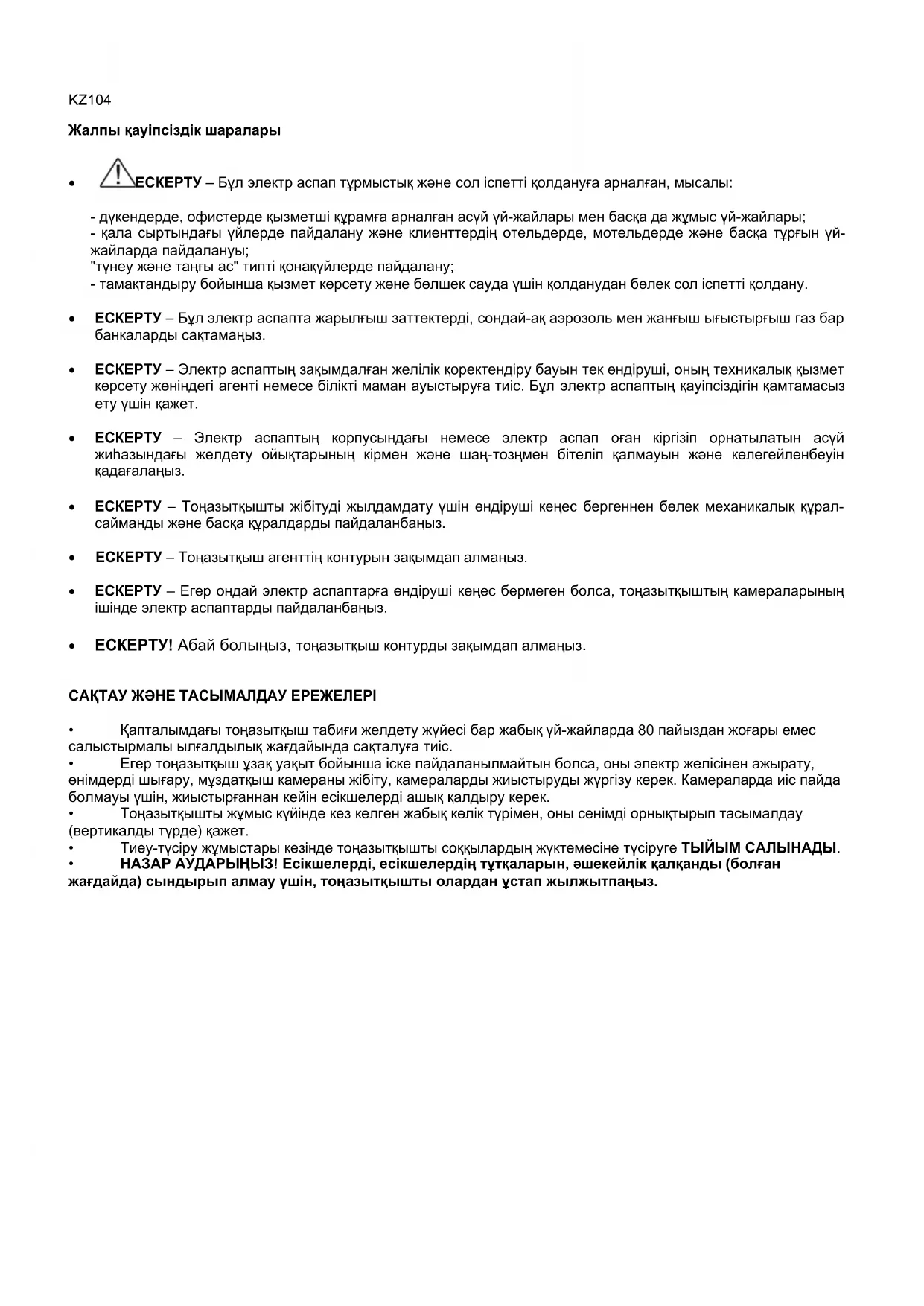 - Тоңазытқыштың ішінде жанғыш газдар мен сұйықтарды сақтамаңыз. Бұл жарылысқа əкеліп соғуы мүмкін.