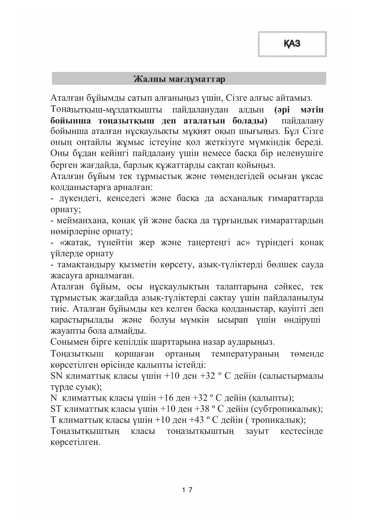 - мейманхана, қонақ үй жəне басқа да тұрғындық ғимараттардың нөмірлеріне орнату; - «жатақ, түнейтін жер жəне таңертеңгі ас» түріндегі қонақ үйлерде орнату - тамақтандыру қызметін көрсету, азық-түліктерді бөлшек сауда жасауға арналмаған. Аталған бұйым, осы нұсқаулықтың талаптарына сəйкес, тек тұрмыстық жағдайда азық-түліктерді сақтау үшін пайдаланылуы тиіс. Аталған бұйымды кез келген басқа қолданыстар, қауіпті деп қарастырылады жəне болуы мүмкін ысырап үшін өндіруші жауапты бола алмайды. Сонымен бірге кепілдік шарттарына назар аударыңыз. Тоңазытқыш қоршаған ортаның температураның төменде көрсетілген өрісінде қалыпты істейді: SN климаттық класы үшін +10 ден +32 º С дейін (салыстырмалы түрде суық); N климаттық класы үшін +16 ден +32 º С дейін (қалыпты); SТ климаттық класы үшін +10 ден +38 º С дейін (субтропикалық); Т климаттық класы үшін +10 ден +43 º С дейін ( тропикалық); Тоңазытқыштың класы тоңазытқыштың зауыт кестесінде көрсетілген. 172Басқа жағдайларда пайдаланған кезде тоңазытқыштың энергетикалық сипаттамалары өндірушінің көрсетілген нұсқауларына сəйкес келмеуі мүмкін. Тоңазытқышты жатын бөлмелерде пайдалануға болмайды. Тоңазытқыш жұмыс істеп тұрған кезде, атқарымдық шулар мен дыбыстардың болатынын ескеру қажет. НАЗАР АУДАРЫҢЫЗ! Оны сақтау немесе дүлей күш əрекеттердің (өрт, дүлей апаттар) кесірінен болған, оны пайдалану шарттарын бұзудың салдарынан пайда болған, бұйымның бүлінуі жəне ақау үшін (соның ішінде, кепілдік кезеңінде) өндіруші жауапты емес. Тасымалдау кезінде тоңазытқыштың бүлінген жерлерінің болмауын тексеріңіз. Оларды тапқан кезде жақын маңдағы Өкілетті Қызмет көрсету Орталығына телефон шалыңыз. ҚАУІПСІЗДІК ТЕХНИКАСЫ БОЙЫНША ТАЛАПТАР