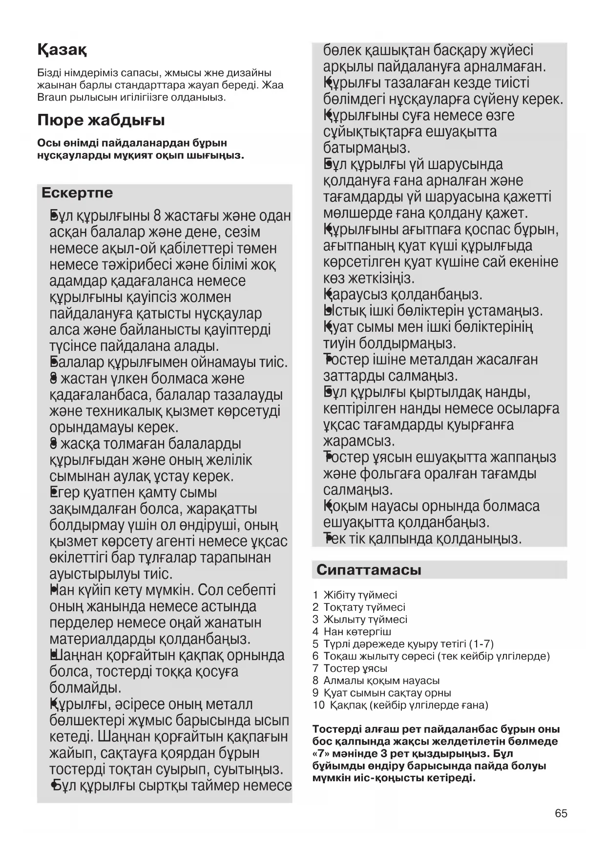 - Αφαιρείτε και αδειάζετε περιστασιακά το δίσκο για τα ψίχουλα (8). 64Қазақ Бізді німдеріміз сапасы, жмысы жне дизайны жаынан барлы стандарттара жауап береді. Жаа Braun рылысын игілігіізге олданыыз. Пюре жабдығы Осы өнімді пайдаланардан бұрын нұсқауларды мұқият оқып шығыңыз.