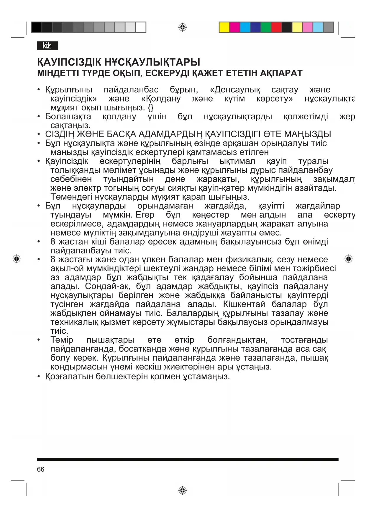 - Бұлнұсқаулықтажәнеқұрылғыныңөзіндеәрқашанорындалуытиіс маңыздықауіпсіздікескертулеріқамтамасызетілген