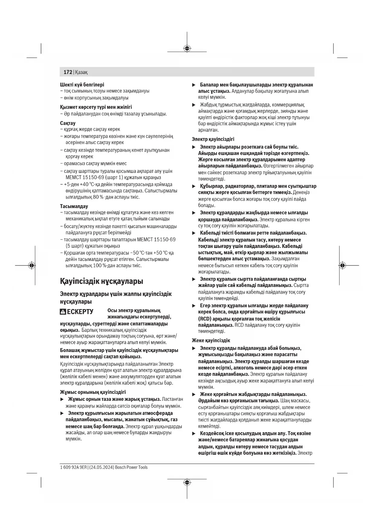 u Қолтұтқалар мен қармау беттерін құрғақ, таза және май мен ластан таза ұстаңыз. Сырғанақ қолтұтқалар мен қармау беттері күтілмеген жағдайларда сенімді қолдану мен бақылауға жол бермейді. Батарея құралын пайдалану және күту u Тек өндіруші сипаттаған зарядтағышмен қайта зарядтаңыз. Батарея жинағының бір түріне сай зарядтағыш басқа батарея жинағымен қолдануда өрт қауіпіне адып келуі мүмкін. u Электр құралдарын тек арнайы тағайындалған батарея жинақтарымен пайдаланыңыз. Кез келген басқа батарея жинақтарын пайдалану жарақаттану мен өрт қауіпіне алып келеді. u Егер батарея жинағы қолдануда болмаса, оны түйреуіш, тиын, кілт, шеге, бұранда немесе басқа кіші метал заттардан ұстаңыз, олар бір терминалдан басқасына байланыс жасауы мүмкін. Батарея терминалдарын қосу күйік немесе өртке алып келуі мүмкін. u Дұрыс емес пайдалануда батареядан сұйықтық ағуы мүмкін, оған тимеңіз. Егер тиіп қалсаңыз, сумен шайып тастаңыз. Егер сұйықтық көзге тисе Bosch Power Tools 1 609 92A 9ER | (24.05.2024)174 | Қазақ дәрігерге хабарласыңыз. Батареядан шаққан сұйықтық қозу немесе күйіктерге алып келуі мүмкін. u Зақымдалған немесе өзгертілген батарея жинақтарын пайдаланбаңыз. Зақымдалған немесе өзгертілген батареялар өртке, жарылуға немесе жарақаттуға алып келуі мүмкін кездейсоқ әрекеттерге алып келуі мүмкін. u Батарея жинағын немесе құралын өртке немесе қатты температураға салдырмаңыз. 130°C жоғары температураларда жарылыс болуы мүмкін. u Барлық зарядтау нұсқауларын орындап батарея жинағын нұсқауларда белгіленген температура ауқымынан тыс жағдайда зарядтамаңыз. Дұрыс емес зарядтау немесе белгіленген ауқымнан тыс температурада зарядтау батареяны зақымдап өрт қауіпін жоғарылатуы мүмкін. Қызмет көрсету u Электр құралына маманды жөндеуші тек бірдей қосалқы бөлшектермен қызмет көрсетуі керек. Бұл электр құралының қауіпсіздігін сақталуын қамтамасыз